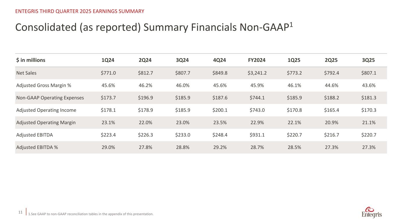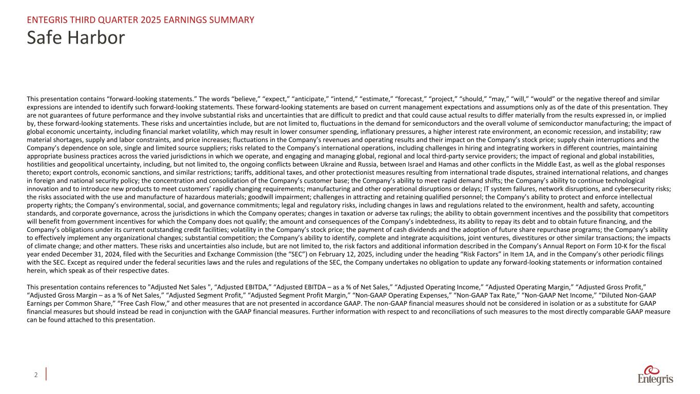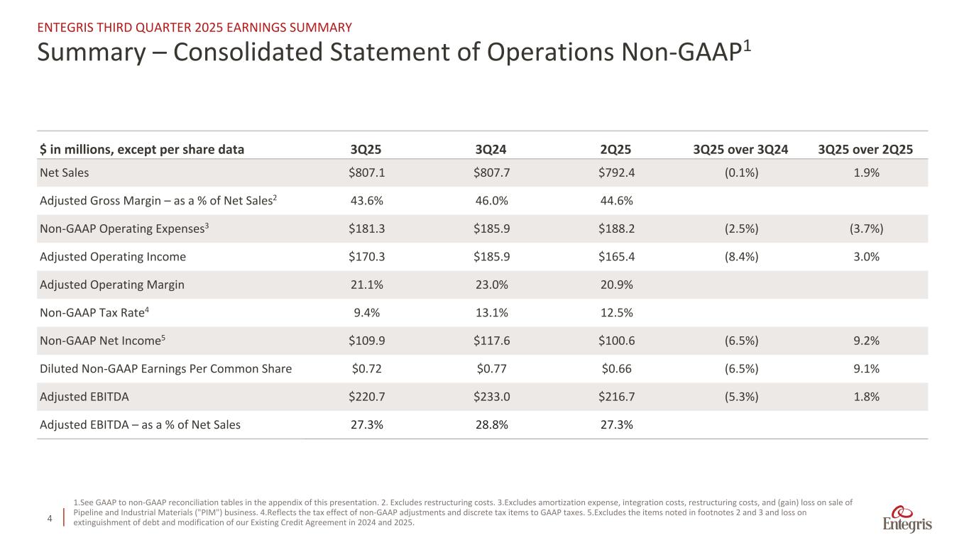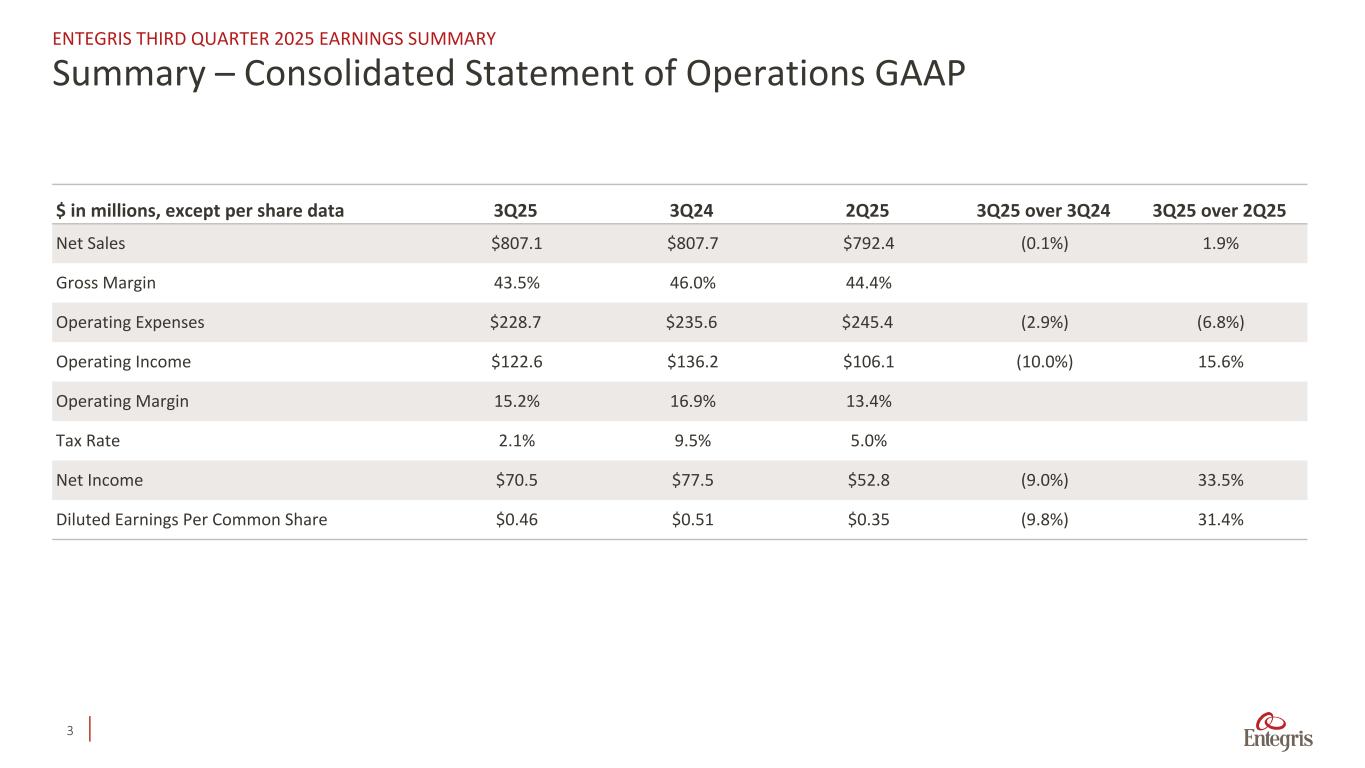 2 Safe Harbor ENTEGRIS THIRD QUARTER 2025 EARNINGS SUMMARY This presentation contains “forward-looking statements.” The words “believe,” “expect,” “anticipate,” “intend,” “estimate,” “forecast,” “project,” “should,” “may,” “will,” “would” or the negative thereof and similar expressions are intended to identify such forward-looking statements. These forward-looking statements are based on current management expectations and assumptions only as of the date of this presentation. They are not guarantees of future performance and they involve substantial risks and uncertainties that are difficult to predict and that could cause actual results to differ materially from the results expressed in, or implied by, these forward-looking statements. These risks and uncertainties include, but are not limited to, fluctuations in the demand for semiconductors and the overall volume of semiconductor manufacturing; the impact of global economic uncertainty, including financial market volatility, which may result in lower consumer spending, inflationary pressures, a higher interest rate environment, an economic recession, and instability; raw material shortages, supply and labor constraints, and price increases; fluctuations in the Company’s revenues and operating results and their impact on the Company’s stock price; supply chain interruptions and the Company’s dependence on sole, single and limited source suppliers; risks related to the Company’s international operations, including challenges in hiring and integrating workers in different countries, maintaining appropriate business practices across the varied jurisdictions in which we operate, and engaging and managing global, regional and local third-party service providers; the impact of regional and global instabilities, hostilities and geopolitical uncertainty, including, but not limited to, the ongoing conflicts between Ukraine and Russia, between Israel and Hamas and other conflicts in the Middle East, as well as the global responses thereto; export controls, economic sanctions, and similar restrictions; tariffs, additional taxes, and other protectionist measures resulting from international trade disputes, strained international relations, and changes in foreign and national security policy; the concentration and consolidation of the Company’s customer base; the Company’s ability to meet rapid demand shifts; the Company’s ability to continue technological innovation and to introduce new products to meet customers’ rapidly changing requirements; manufacturing and other operational disruptions or delays; IT system failures, network disruptions, and cybersecurity risks; the risks associated with the use and manufacture of hazardous materials; goodwill impairment; challenges in attracting and retaining qualified personnel; the Company’s ability to protect and enforce intellectual property rights; the Company’s environmental, social, and governance commitments; legal and regulatory risks, including changes in laws and regulations related to the environment, health and safety, accounting standards, and corporate governance, across the jurisdictions in which the Company operates; changes in taxation or adverse tax rulings; the ability to obtain government incentives and the possibility that competitors will benefit from government incentives for which the Company does not qualify; the amount and consequences of the Company’s indebtedness, its ability to repay its debt and to obtain future financing, and the Company’s obligations under its current outstanding credit facilities; volatility in the Company’s stock price; the payment of cash dividends and the adoption of future share repurchase programs; the Company’s ability to effectively implement any organizational changes; substantial competition; the Company’s ability to identify, complete and integrate acquisitions, joint ventures, divestitures or other similar transactions; the impacts of climate change; and other matters. These risks and uncertainties also include, but are not limited to, the risk factors and additional information described in the Company’s Annual Report on Form 10-K for the fiscal year ended December 31, 2024, filed with the Securities and Exchange Commission (the “SEC”) on February 12, 2025, including under the heading “Risk Factors” in Item 1A, and in the Company’s other periodic filings with the SEC. Except as required under the federal securities laws and the rules and regulations of the SEC, the Company undertakes no obligation to update any forward-looking statements or information contained herein, which speak as of their respective dates. This presentation contains references to "Adjusted Net Sales ", “Adjusted EBITDA,” “Adjusted EBITDA – as a % of Net Sales,” “Adjusted Operating Income,” “Adjusted Operating Margin,” “Adjusted Gross Profit,” “Adjusted Gross Margin – as a % of Net Sales,” “Adjusted Segment Profit,” “Adjusted Segment Profit Margin,” “Non-GAAP Operating Expenses,” “Non-GAAP Tax Rate,” “Non-GAAP Net Income,” “Diluted Non-GAAP Earnings per Common Share,” “Free Cash Flow,” and other measures that are not presented in accordance GAAP. The non-GAAP financial measures should not be considered in isolation or as a substitute for GAAP financial measures but should instead be read in conjunction with the GAAP financial measures. Further information with respect to and reconciliations of such measures to the most directly comparable GAAP measure can be found attached to this presentation.