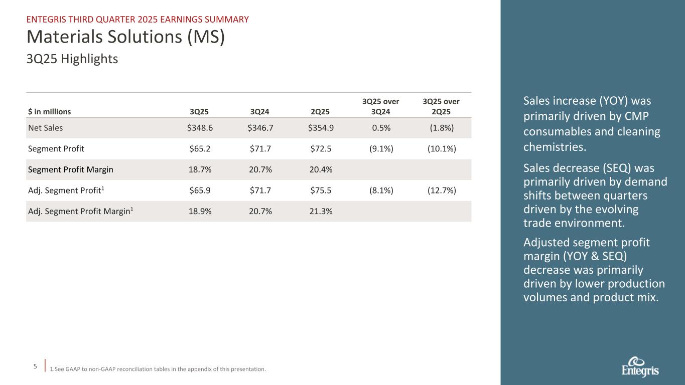 4 Summary – Consolidated Statement of Operations Non-GAAP1 ENTEGRIS THIRD QUARTER 2025 EARNINGS SUMMARY $ in millions, except per share data 3Q25 3Q24 2Q25 3Q25 over 3Q24 3Q25 over 2Q25 Net Sales $807.1 $807.7 $792.4 (0.1%) 1.9% Adjusted Gross Margin – as a % of Net Sales2 43.6% 46.0% 44.6% Non-GAAP Operating Expenses3 $181.3 $185.9 $188.2 (2.5%) (3.7%) Adjusted Operating Income $170.3 $185.9 $165.4 (8.4%) 3.0% Adjusted Operating Margin 21.1% 23.0% 20.9% Non-GAAP Tax Rate4 9.4% 13.1% 12.5% Non-GAAP Net Income5 $109.9 $117.6 $100.6 (6.5%) 9.2% Diluted Non-GAAP Earnings Per Common Share $0.72 $0.77 $0.66 (6.5%) 9.1% Adjusted EBITDA $220.7 $233.0 $216.7 (5.3%) 1.8% Adjusted EBITDA – as a % of Net Sales 27.3% 28.8% 27.3% 1.See GAAP to non-GAAP reconciliation tables in the appendix of this presentation. 2. Excludes restructuring costs. 3.Excludes amortization expense, integration costs, restructuring costs, and (gain) loss on sale of Pipeline and Industrial Materials ("PIM") business. 4.Reflects the tax effect of non-GAAP adjustments and discrete tax items to GAAP taxes. 5.Excludes the items noted in footnotes 2 and 3 and loss on extinguishment of debt and modification of our Existing Credit Agreement in 2024 and 2025.