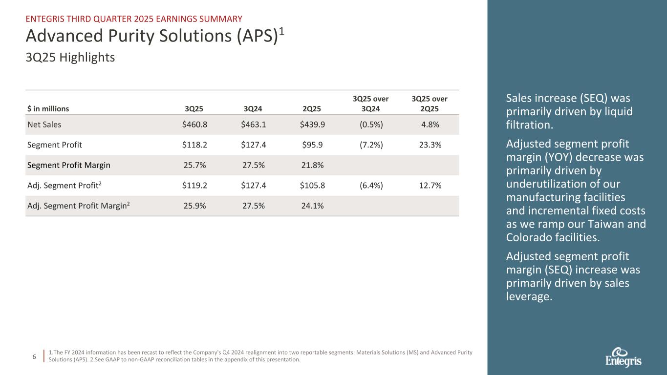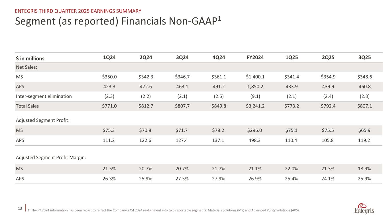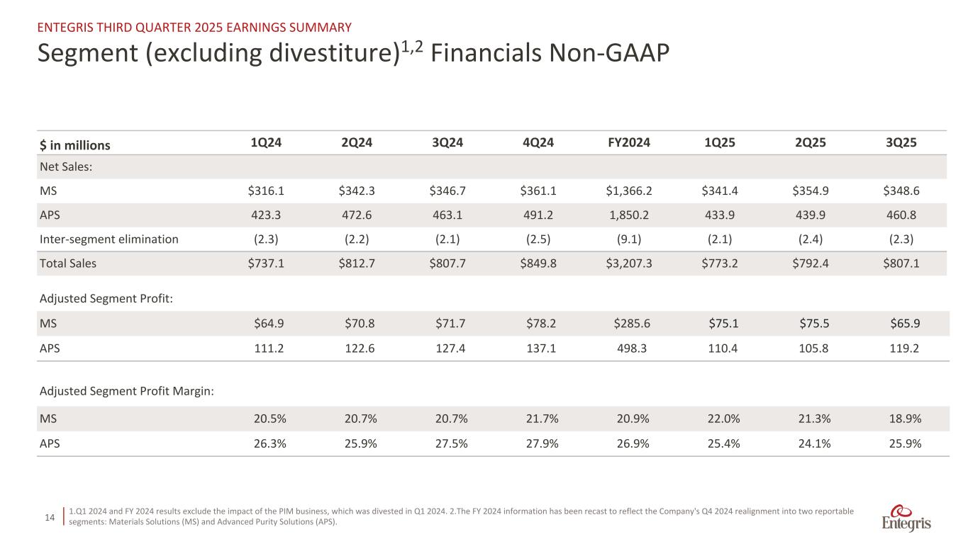 13 ENTEGRIS THIRD QUARTER 2025 EARNINGS SUMMARY 1. The FY 2024 information has been recast to reflect the Company's Q4 2024 realignment into two reportable segments: Materials Solutions (MS) and Advanced Purity Solutions (APS). Segment (as reported) Financials Non-GAAP1 Adjusted Segment Profit: MS $75.3 $70.8 $71.7 $78.2 $296.0 $75.1 $75.5 $65.9 APS 111.2 122.6 127.4 137.1 498.3 110.4 105.8 119.2 Adjusted Segment Profit Margin: MS 21.5% 20.7% 20.7% 21.7% 21.1% 22.0% 21.3% 18.9% APS 26.3% 25.9% 27.5% 27.9% 26.9% 25.4% 24.1% 25.9% $ in millions 1Q24 2Q24 3Q24 4Q24 FY2024 1Q25 2Q25 3Q25 Net Sales: MS $350.0 $342.3 $346.7 $361.1 $1,400.1 $341.4 $354.9 $348.6 APS 423.3 472.6 463.1 491.2 1,850.2 433.9 439.9 460.8 Inter-segment elimination (2.3) (2.2) (2.1) (2.5) (9.1) (2.1) (2.4) (2.3) Total Sales $771.0 $812.7 $807.7 $849.8 $3,241.2 $773.2 $792.4 $807.1