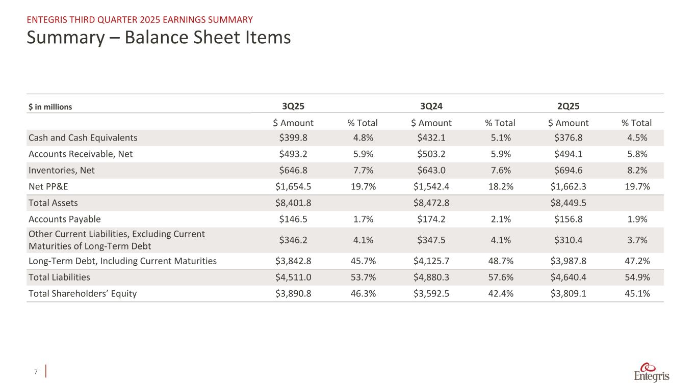 6 Sales increase (SEQ) was primarily driven by liquid filtration. Adjusted segment profit margin (YOY) decrease was primarily driven by underutilization of our manufacturing facilities and incremental fixed costs as we ramp our Taiwan and Colorado facilities. Adjusted segment profit margin (SEQ) increase was primarily driven by sales leverage. $ in millions 3Q25 3Q24 2Q25 3Q25 over 3Q24 3Q25 over 2Q25 Net Sales $460.8 $463.1 $439.9 (0.5%) 4.8% Segment Profit $118.2 $127.4 $95.9 (7.2%) 23.3% Segment Profit Margin 25.7% 27.5% 21.8% Adj. Segment Profit2 $119.2 $127.4 $105.8 (6.4%) 12.7% Adj. Segment Profit Margin2 25.9% 27.5% 24.1% Advanced Purity Solutions (APS)1 ENTEGRIS THIRD QUARTER 2025 EARNINGS SUMMARY 3Q25 Highlights 1.The FY 2024 information has been recast to reflect the Company's Q4 2024 realignment into two reportable segments: Materials Solutions (MS) and Advanced Purity Solutions (APS). 2.See GAAP to non-GAAP reconciliation tables in the appendix of this presentation.