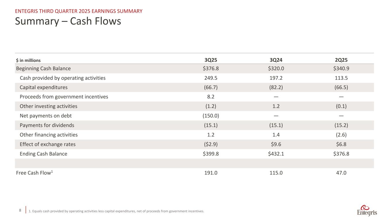 7 Summary – Balance Sheet Items ENTEGRIS THIRD QUARTER 2025 EARNINGS SUMMARY $ in millions 3Q25 3Q24 2Q25 $ Amount % Total $ Amount % Total $ Amount % Total Cash and Cash Equivalents $399.8 4.8% $432.1 5.1% $376.8 4.5% Accounts Receivable, Net $493.2 5.9% $503.2 5.9% $494.1 5.8% Inventories, Net $646.8 7.7% $643.0 7.6% $694.6 8.2% Net PP&E $1,654.5 19.7% $1,542.4 18.2% $1,662.3 19.7% Total Assets $8,401.8 $8,472.8 $8,449.5 Accounts Payable $146.5 1.7% $174.2 2.1% $156.8 1.9% Other Current Liabilities, Excluding Current Maturities of Long-Term Debt $346.2 4.1% $347.5 4.1% $310.4 3.7% Long-Term Debt, Including Current Maturities $3,842.8 45.7% $4,125.7 48.7% $3,987.8 47.2% Total Liabilities $4,511.0 53.7% $4,880.3 57.6% $4,640.4 54.9% Total Shareholders’ Equity $3,890.8 46.3% $3,592.5 42.4% $3,809.1 45.1%