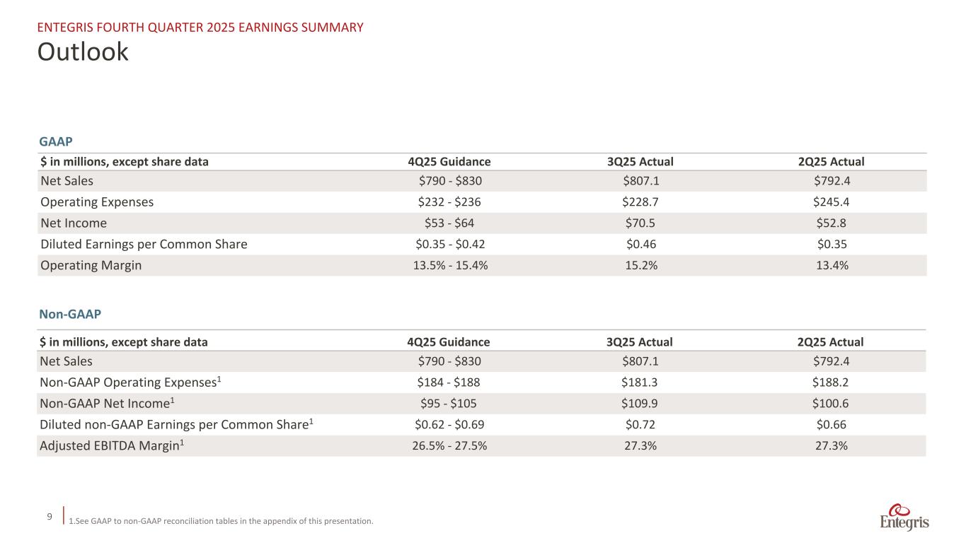 9 ENTEGRIS FOURTH QUARTER 2025 EARNINGS SUMMARY 1.See GAAP to non-GAAP reconciliation tables in the appendix of this presentation. GAAP $ in millions, except share data 4Q25 Guidance 3Q25 Actual 2Q25 Actual Net Sales $790 - $830 $807.1 $792.4 Non-GAAP Operating Expenses1 $184 - $188 $181.3 $188.2 Non-GAAP Net Income1 $95 - $105 $109.9 $100.6 Diluted non-GAAP Earnings per Common Share1 $0.62 - $0.69 $0.72 $0.66 Adjusted EBITDA Margin1 26.5% - 27.5% 27.3% 27.3% Non-GAAP $ in millions, except share data 4Q25 Guidance 3Q25 Actual 2Q25 Actual Net Sales $790 - $830 $807.1 $792.4 Operating Expenses $232 - $236 $228.7 $245.4 Net Income $53 - $64 $70.5 $52.8 Diluted Earnings per Common Share $0.35 - $0.42 $0.46 $0.35 Operating Margin 13.5% - 15.4% 15.2% 13.4% Outlook