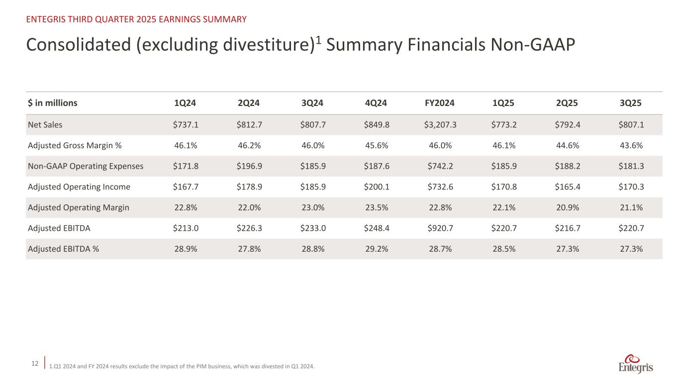 11 Consolidated (as reported) Summary Financials Non-GAAP1 ENTEGRIS THIRD QUARTER 2025 EARNINGS SUMMARY $ in millions 1Q24 2Q24 3Q24 4Q24 FY2024 1Q25 2Q25 3Q25 Net Sales $771.0 $812.7 $807.7 $849.8 $3,241.2 $773.2 $792.4 $807.1 Adjusted Gross Margin % 45.6% 46.2% 46.0% 45.6% 45.9% 46.1% 44.6% 43.6% Non-GAAP Operating Expenses $173.7 $196.9 $185.9 $187.6 $744.1 $185.9 $188.2 $181.3 Adjusted Operating Income $178.1 $178.9 $185.9 $200.1 $743.0 $170.8 $165.4 $170.3 Adjusted Operating Margin 23.1% 22.0% 23.0% 23.5% 22.9% 22.1% 20.9% 21.1% Adjusted EBITDA $223.4 $226.3 $233.0 $248.4 $931.1 $220.7 $216.7 $220.7 Adjusted EBITDA % 29.0% 27.8% 28.8% 29.2% 28.7% 28.5% 27.3% 27.3% 1.See GAAP to non-GAAP reconciliation tables in the appendix of this presentation.