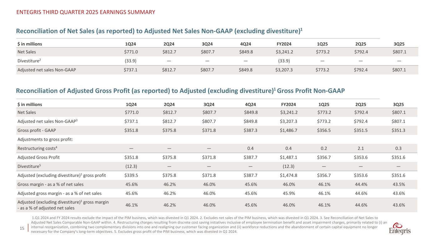 14 ENTEGRIS THIRD QUARTER 2025 EARNINGS SUMMARY 1.Q1 2024 and FY 2024 results exclude the impact of the PIM business, which was divested in Q1 2024. 2.The FY 2024 information has been recast to reflect the Company's Q4 2024 realignment into two reportable segments: Materials Solutions (MS) and Advanced Purity Solutions (APS). Segment (excluding divestiture)1,2 Financials Non-GAAP Adjusted Segment Profit: MS $64.9 $70.8 $71.7 $78.2 $285.6 $75.1 $75.5 $65.9 APS 111.2 122.6 127.4 137.1 498.3 110.4 105.8 119.2 Adjusted Segment Profit Margin: MS 20.5% 20.7% 20.7% 21.7% 20.9% 22.0% 21.3% 18.9% APS 26.3% 25.9% 27.5% 27.9% 26.9% 25.4% 24.1% 25.9% $ in millions 1Q24 2Q24 3Q24 4Q24 FY2024 1Q25 2Q25 3Q25 Net Sales: MS $316.1 $342.3 $346.7 $361.1 $1,366.2 $341.4 $354.9 $348.6 APS 423.3 472.6 463.1 491.2 1,850.2 433.9 439.9 460.8 Inter-segment elimination (2.3) (2.2) (2.1) (2.5) (9.1) (2.1) (2.4) (2.3) Total Sales $737.1 $812.7 $807.7 $849.8 $3,207.3 $773.2 $792.4 $807.1