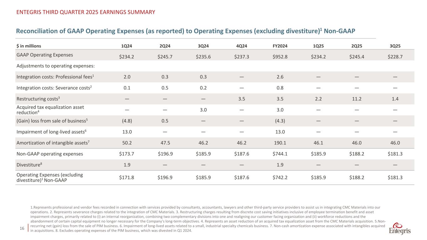 15 ENTEGRIS THIRD QUARTER 2025 EARNINGS SUMMARY 1.Q1 2024 and FY 2024 results exclude the impact of the PIM business, which was divested in Q1 2024. 2. Excludes net sales of the PIM business, which was divested in Q1 2024. 3. See Reconciliation of Net Sales to Adjusted Net Sales Comparable Non-GAAP within. 4. Restructuring charges resulting from discrete cost saving initiatives inclusive of employee termination benefit and asset impairment charges, primarily related to (i) an internal reorganization, combining two complementary divisions into one and realigning our customer facing organization and (ii) workforce reductions and the abandonment of certain capital equipment no longer necessary for the Company’s long-term objectives. 5. Excludes gross profit of the PIM business, which was divested in Q1 2024. $ in millions 1Q24 2Q24 3Q24 4Q24 FY2024 1Q25 2Q25 3Q25 Net Sales $771.0 $812.7 $807.7 $849.8 $3,241.2 $773.2 $792.4 $807.1 Adjusted net sales Non-GAAP3 $737.1 $812.7 $807.7 $849.8 $3,207.3 $773.2 $792.4 $807.1 Gross profit - GAAP $351.8 $375.8 $371.8 $387.3 $1,486.7 $356.5 $351.5 $351.3 Adjustments to gross profit: Restructuring costs4 — — — 0.4 0.4 0.2 2.1 0.3 Adjusted Gross Profit $351.8 $375.8 $371.8 $387.7 $1,487.1 $356.7 $353.6 $351.6 Divestiture5 (12.3) — — — (12.3) — — — Adjusted (excluding divestiture)1 gross profit $339.5 $375.8 $371.8 $387.7 $1,474.8 $356.7 $353.6 $351.6 Gross margin - as a % of net sales 45.6% 46.2% 46.0% 45.6% 46.0% 46.1% 44.4% 43.5% Adjusted gross margin - as a % of net sales 45.6% 46.2% 46.0% 45.6% 45.9% 46.1% 44.6% 43.6% Adjusted (excluding divestiture)1 gross margin - as a % of adjusted net sales 46.1% 46.2% 46.0% 45.6% 46.0% 46.1% 44.6% 43.6% Reconciliation of Adjusted Gross Profit (as reported) to Adjusted (excluding divestiture)1 Gross Profit Non-GAAP $ in millions 1Q24 2Q24 3Q24 4Q24 FY2024 1Q25 2Q25 3Q25 Net Sales $771.0 $812.7 $807.7 $849.8 $3,241.2 $773.2 $792.4 $807.1 Divestiture2 (33.9) — — — (33.9) — — — Adjusted net sales Non-GAAP $737.1 $812.7 $807.7 $849.8 $3,207.3 $773.2 $792.4 $807.1 Reconciliation of Net Sales (as reported) to Adjusted Net Sales Non-GAAP (excluding divestiture)1