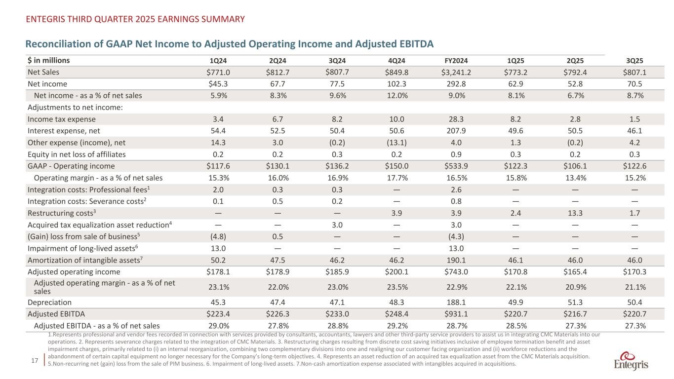 16 ENTEGRIS THIRD QUARTER 2025 EARNINGS SUMMARY 1.Represents professional and vendor fees recorded in connection with services provided by consultants, accountants, lawyers and other third-party service providers to assist us in integrating CMC Materials into our operations. 2. Represents severance charges related to the integration of CMC Materials. 3. Restructuring charges resulting from discrete cost saving initiatives inclusive of employee termination benefit and asset impairment charges, primarily related to (i) an internal reorganization, combining two complementary divisions into one and realigning our customer facing organization and (ii) workforce reductions and the abandonment of certain capital equipment no longer necessary for the Company’s long-term objectives. 4. Represents an asset reduction of an acquired tax equalization asset from the CMC Materials acquisition. 5.Non- recurring net (gain) loss from the sale of PIM business. 6. Impairment of long-lived assets related to a small, industrial specialty chemicals business. 7. Non-cash amortization expense associated with intangibles acquired in acquisitions. 8. Excludes operating expenses of the PIM business, which was divested in Q1 2024. Reconciliation of GAAP Operating Expenses (as reported) to Operating Expenses (excluding divestiture)1 Non-GAAP $ in millions 1Q24 2Q24 3Q24 4Q24 FY2024 1Q25 2Q25 3Q25 GAAP Operating Expenses $234.2 $245.7 $235.6 $237.3 $952.8 $234.2 $245.4 $228.7 Adjustments to operating expenses: Integration costs: Professional fees1 2.0 0.3 0.3 — 2.6 — — — Integration costs: Severance costs2 0.1 0.5 0.2 — 0.8 — — — Restructuring costs3 — — — 3.5 3.5 2.2 11.2 1.4 Acquired tax equalization asset reduction4 — — 3.0 — 3.0 — — — (Gain) loss from sale of business5 (4.8) 0.5 — — (4.3) — — — Impairment of long-lived assets6 13.0 — — — 13.0 — — — Amortization of intangible assets7 50.2 47.5 46.2 46.2 190.1 46.1 46.0 46.0 Non-GAAP operating expenses $173.7 $196.9 $185.9 $187.6 $744.1 $185.9 $188.2 $181.3 Divestiture8 1.9 — — — 1.9 — — — Operating Expenses (excluding divestiture)1 Non-GAAP $171.8 $196.9 $185.9 $187.6 $742.2 $185.9 $188.2 $181.3