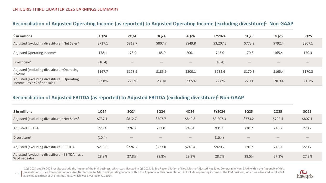 17 ENTEGRIS THIRD QUARTER 2025 EARNINGS SUMMARY 1.Represents professional and vendor fees recorded in connection with services provided by consultants, accountants, lawyers and other third-party service providers to assist us in integrating CMC Materials into our operations. 2. Represents severance charges related to the integration of CMC Materials. 3. Restructuring charges resulting from discrete cost saving initiatives inclusive of employee termination benefit and asset impairment charges, primarily related to (i) an internal reorganization, combining two complementary divisions into one and realigning our customer facing organization and (ii) workforce reductions and the abandonment of certain capital equipment no longer necessary for the Company’s long-term objectives. 4. Represents an asset reduction of an acquired tax equalization asset from the CMC Materials acquisition. 5.Non-recurring net (gain) loss from the sale of PIM business. 6. Impairment of long-lived assets. 7.Non-cash amortization expense associated with intangibles acquired in acquisitions. Reconciliation of GAAP Net Income to Adjusted Operating Income and Adjusted EBITDA $ in millions 1Q24 2Q24 3Q24 4Q24 FY2024 1Q25 2Q25 3Q25 Net Sales $771.0 $812.7 $807.7 $849.8 $3,241.2 $773.2 $792.4 $807.1 Net income $45.3 67.7 77.5 102.3 292.8 62.9 52.8 70.5 Net income - as a % of net sales 5.9% 8.3% 9.6% 12.0% 9.0% 8.1% 6.7% 8.7% Adjustments to net income: Income tax expense 3.4 6.7 8.2 10.0 28.3 8.2 2.8 1.5 Interest expense, net 54.4 52.5 50.4 50.6 207.9 49.6 50.5 46.1 Other expense (income), net 14.3 3.0 (0.2) (13.1) 4.0 1.3 (0.2) 4.2 Equity in net loss of affiliates 0.2 0.2 0.3 0.2 0.9 0.3 0.2 0.3 GAAP - Operating income $117.6 $130.1 $136.2 $150.0 $533.9 $122.3 $106.1 $122.6 Operating margin - as a % of net sales 15.3% 16.0% 16.9% 17.7% 16.5% 15.8% 13.4% 15.2% Integration costs: Professional fees1 2.0 0.3 0.3 — 2.6 — — — Integration costs: Severance costs2 0.1 0.5 0.2 — 0.8 — — — Restructuring costs3 — — — 3.9 3.9 2.4 13.3 1.7 Acquired tax equalization asset reduction4 — — 3.0 — 3.0 — — — (Gain) loss from sale of business5 (4.8) 0.5 — — (4.3) — — — Impairment of long-lived assets6 13.0 — — — 13.0 — — — Amortization of intangible assets7 50.2 47.5 46.2 46.2 190.1 46.1 46.0 46.0 Adjusted operating income $178.1 $178.9 $185.9 $200.1 $743.0 $170.8 $165.4 $170.3 Adjusted operating margin - as a % of net sales 23.1% 22.0% 23.0% 23.5% 22.9% 22.1% 20.9% 21.1% Depreciation 45.3 47.4 47.1 48.3 188.1 49.9 51.3 50.4 Adjusted EBITDA $223.4 $226.3 $233.0 $248.4 $931.1 $220.7 $216.7 $220.7 Adjusted EBITDA - as a % of net sales 29.0% 27.8% 28.8% 29.2% 28.7% 28.5% 27.3% 27.3%