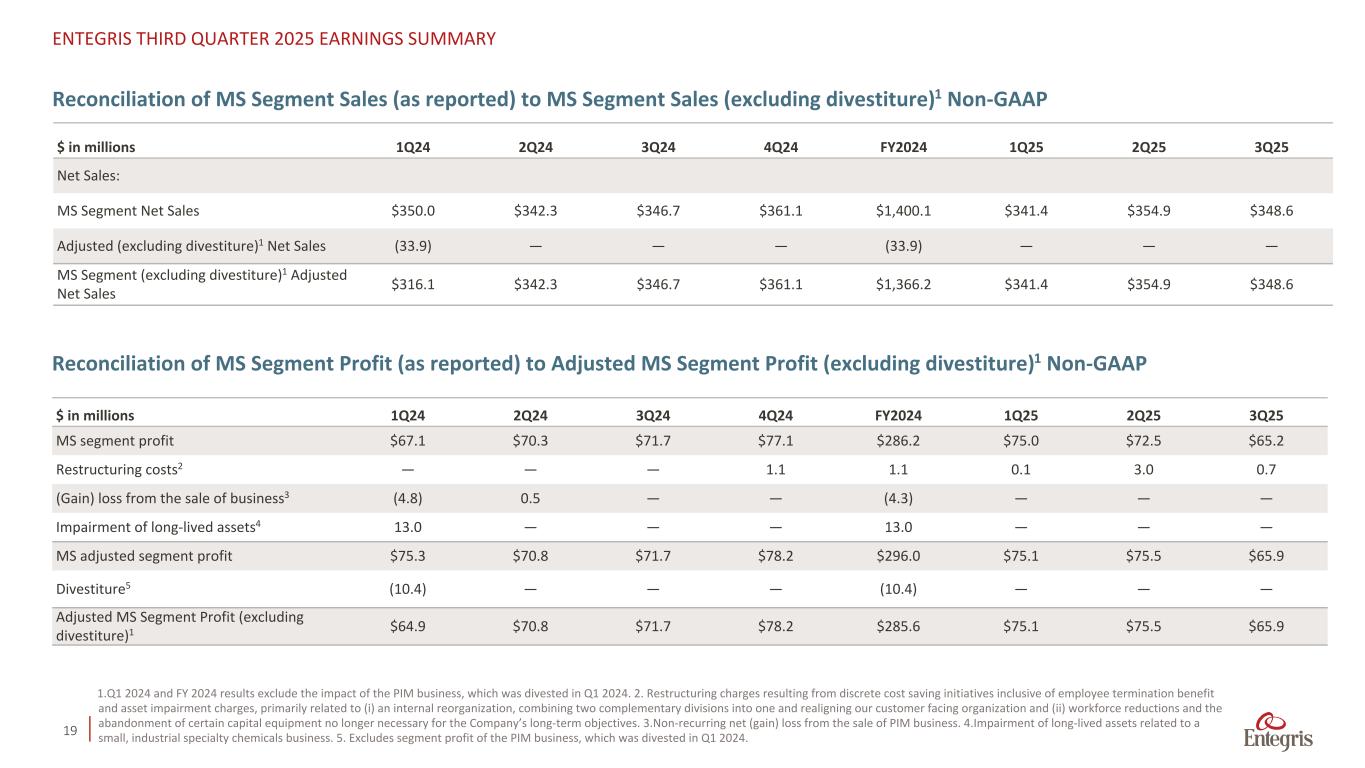 18 ENTEGRIS THIRD QUARTER 2025 EARNINGS SUMMARY 1.Q1 2024 and FY 2024 results exclude the impact of the PIM business, which was divested in Q1 2024. 2. See Reconciliation of Net Sales to Adjusted Net Sales Comparable Non-GAAP within the Appendix of this presentation. 3. See Reconciliation of GAAP Net Income to Adjusted Operating Income within the Appendix of this presentation. 4. Excludes operating income of the PIM business, which was divested in Q1 2024. 5. Excludes EBITDA of the PIM business, which was divested in Q1 2024. Reconciliation of Adjusted Operating Income (as reported) to Adjusted Operating Income (excluding divestiture)1 Non-GAAP $ in millions 1Q24 2Q24 3Q24 4Q24 FY2024 1Q25 2Q25 3Q25 Adjusted (excluding divestiture)1 Net Sales2 $737.1 $812.7 $807.7 $849.8 $3,207.3 $773.2 $792.4 $807.1 Adjusted EBITDA 223.4 226.3 233.0 248.4 931.1 220.7 216.7 220.7 Divestiture5 (10.4) — — — (10.4) — — — Adjusted (excluding divestiture)1 EBITDA $213.0 $226.3 $233.0 $248.4 $920.7 220.7 216.7 220.7 Adjusted (excluding divestiture)1 EBITDA - as a % of net sales 28.9% 27.8% 28.8% 29.2% 28.7% 28.5% 27.3% 27.3% Reconciliation of Adjusted EBITDA (as reported) to Adjusted EBITDA (excluding divestiture)1 Non-GAAP $ in millions 1Q24 2Q24 3Q24 4Q24 FY2024 1Q25 2Q25 3Q25 Adjusted (excluding divestiture)1 Net Sales2 $737.1 $812.7 $807.7 $849.8 $3,207.3 $773.2 $792.4 $807.1 Adjusted Operating Income3 178.1 178.9 185.9 200.1 743.0 170.8 165.4 170.3 Divestiture4 (10.4) — — — (10.4) — — — Adjusted (excluding divestiture)1 Operating Income $167.7 $178.9 $185.9 $200.1 $732.6 $170.8 $165.4 $170.3 Adjusted (excluding divestiture)1 Operating Income - as a % of net sales 22.8% 22.0% 23.0% 23.5% 22.8% 22.1% 20.9% 21.1%