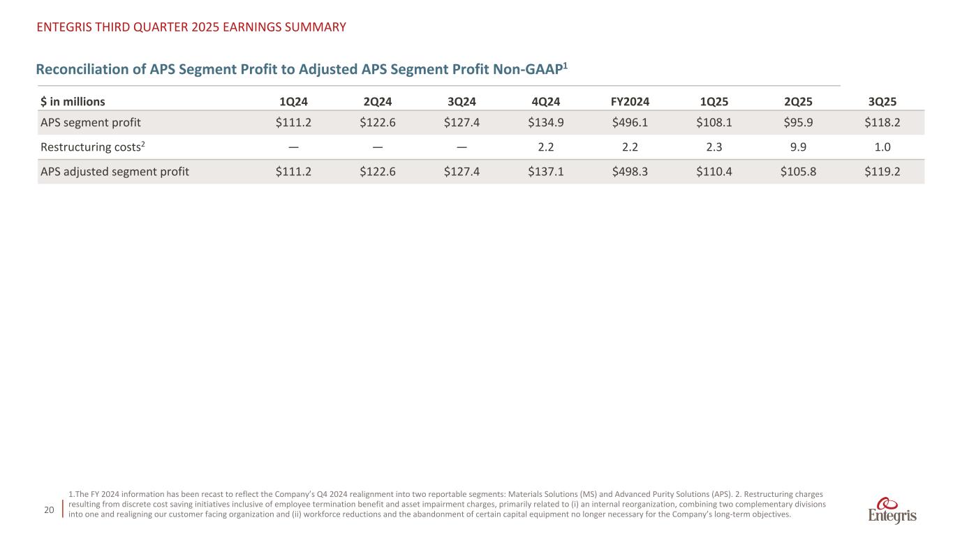 19 ENTEGRIS THIRD QUARTER 2025 EARNINGS SUMMARY 1.Q1 2024 and FY 2024 results exclude the impact of the PIM business, which was divested in Q1 2024. 2. Restructuring charges resulting from discrete cost saving initiatives inclusive of employee termination benefit and asset impairment charges, primarily related to (i) an internal reorganization, combining two complementary divisions into one and realigning our customer facing organization and (ii) workforce reductions and the abandonment of certain capital equipment no longer necessary for the Company’s long-term objectives. 3.Non-recurring net (gain) loss from the sale of PIM business. 4.Impairment of long-lived assets related to a small, industrial specialty chemicals business. 5. Excludes segment profit of the PIM business, which was divested in Q1 2024. Reconciliation of MS Segment Sales (as reported) to MS Segment Sales (excluding divestiture)1 Non-GAAP $ in millions 1Q24 2Q24 3Q24 4Q24 FY2024 1Q25 2Q25 3Q25 MS segment profit $67.1 $70.3 $71.7 $77.1 $286.2 $75.0 $72.5 $65.2 Restructuring costs2 — — — 1.1 1.1 0.1 3.0 0.7 (Gain) loss from the sale of business3 (4.8) 0.5 — — (4.3) — — — Impairment of long-lived assets4 13.0 — — — 13.0 — — — MS adjusted segment profit $75.3 $70.8 $71.7 $78.2 $296.0 $75.1 $75.5 $65.9 Divestiture5 (10.4) — — — (10.4) — — — Adjusted MS Segment Profit (excluding divestiture)1 $64.9 $70.8 $71.7 $78.2 $285.6 $75.1 $75.5 $65.9 Reconciliation of MS Segment Profit (as reported) to Adjusted MS Segment Profit (excluding divestiture)1 Non-GAAP $ in millions 1Q24 2Q24 3Q24 4Q24 FY2024 1Q25 2Q25 3Q25 Net Sales: MS Segment Net Sales $350.0 $342.3 $346.7 $361.1 $1,400.1 $341.4 $354.9 $348.6 Adjusted (excluding divestiture)1 Net Sales (33.9) — — — (33.9) — — — MS Segment (excluding divestiture)1 Adjusted Net Sales $316.1 $342.3 $346.7 $361.1 $1,366.2 $341.4 $354.9 $348.6