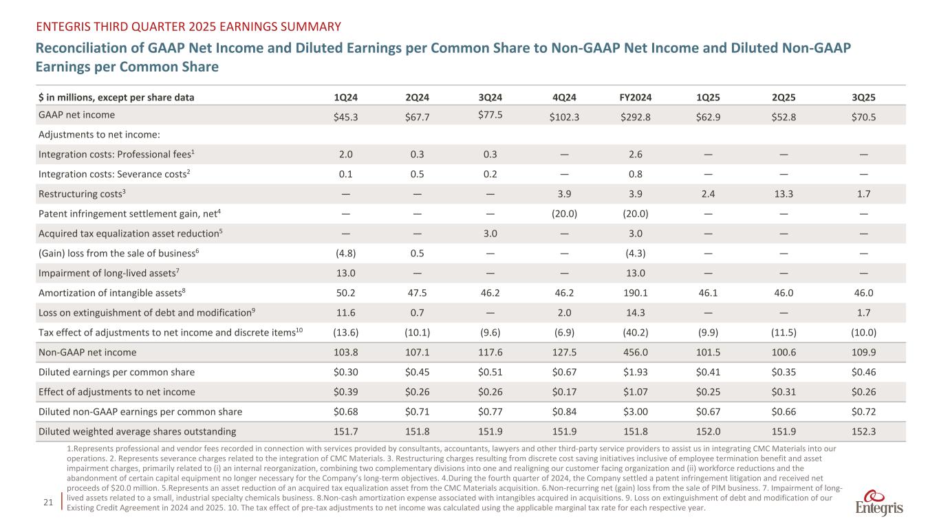 20 ENTEGRIS THIRD QUARTER 2025 EARNINGS SUMMARY 1.The FY 2024 information has been recast to reflect the Company’s Q4 2024 realignment into two reportable segments: Materials Solutions (MS) and Advanced Purity Solutions (APS). 2. Restructuring charges resulting from discrete cost saving initiatives inclusive of employee termination benefit and asset impairment charges, primarily related to (i) an internal reorganization, combining two complementary divisions into one and realigning our customer facing organization and (ii) workforce reductions and the abandonment of certain capital equipment no longer necessary for the Company’s long-term objectives. Reconciliation of APS Segment Profit to Adjusted APS Segment Profit Non-GAAP1 $ in millions 1Q24 2Q24 3Q24 4Q24 FY2024 1Q25 2Q25 3Q25 APS segment profit $111.2 $122.6 $127.4 $134.9 $496.1 $108.1 $95.9 $118.2 Restructuring costs2 — — — 2.2 2.2 2.3 9.9 1.0 APS adjusted segment profit $111.2 $122.6 $127.4 $137.1 $498.3 $110.4 $105.8 $119.2