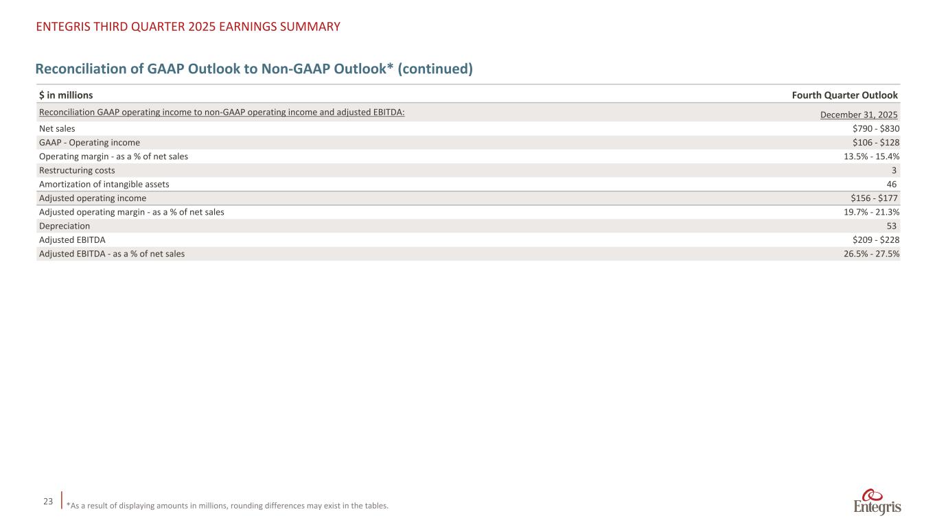 22 ENTEGRIS FOURTH QUARTER 2025 EARNINGS SUMMARY *As a result of displaying amounts in millions, rounding differences may exist in the tables. Reconciliation of GAAP Outlook to Non-GAAP Outlook* $ in millions Fourth Quarter Outlook Reconciliation GAAP operating expenses to non-GAAP operating expenses: December 31, 2025 GAAP operating expenses $232 - $236 Adjustments to net income: Restructuring costs 2 Amortization of intangible assets 46 Non-GAAP operating expenses $184 - $188 $ in millions Fourth Quarter Outlook Reconciliation GAAP net income to non-GAAP net income: December 31, 2025 GAAP net income $53 - $64 Adjustments to net income: Restructuring costs 3 Amortization of intangible assets 46 Income tax effect (8) Non-GAAP net income $95 - $105 $ in millions, except per share data Fourth Quarter Outlook Reconciliation GAAP diluted earnings per share to non-GAAP diluted earnings per share: December 31, 2025 Diluted earnings per common share $0.35 - $0.42 Adjustments to diluted earnings per common share: Restructuring costs 0.02 Amortization of intangible assets 0.30 Income tax effect (0.05) Diluted non-GAAP earnings per common share $0.62 - $0.69