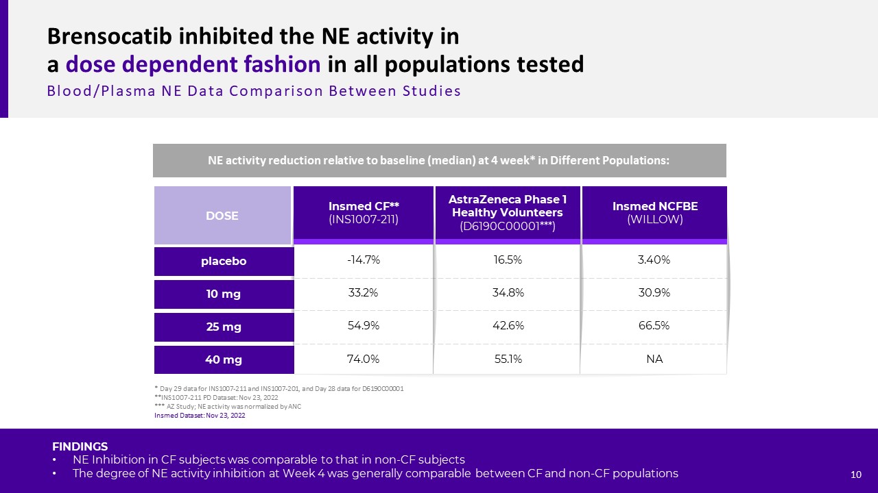 Brensocatib inhibited the NE activity in a dose dependent fashion in all populations tested   Blood/Plasma NE Data Comparison Between Studies  AstraZeneca Phase 1 Healthy Volunteers  (D6190C00001***)  Insmed NCFBE  (WILLOW)  Insmed CF**(INS1007-211)  10 mg  25 mg  DOSE  40 mg  placebo  -14.7%  33.2%  54.9%  74.0%  16.5%  34.8%  42.6%  55.1%  3.40%  30.9%  66.5%  NA  NE activity reduction relative to baseline (median) at 4 week* in Different Populations:  * Day 29 data for INS1007-211 and INS1007-201, and Day 28 data for D6190C00001  **INS1007-211 PD Dataset: Nov 23, 2022  *** AZ Study; NE activity was normalized by ANC  FINDINGS  NE Inhibition in CF subjects was comparable to that in non-CF subjects  The degree of NE activity inhibition at Week 4 was generally comparable between CF and non-CF populations     10  Insmed Dataset: Nov 23, 2022