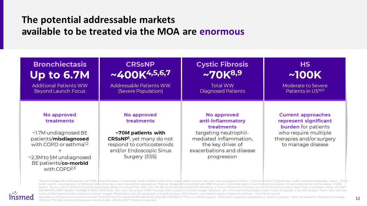 The potential addressable markets available to be treated via the MOA are enormous  CRSsNP  ~400K4,5,6,7  Addressable Patients WW (Severe Population)  No approved treatments  ~70M patients with CRSsNP1, yet many do not respond to corticosteroids and/or Endoscopic Sinus Surgery (ESS)  Cystic Fibrosis  ~70K8,9   Total WW Diagnosed Patients  No approved anti-inflammatory treatments targeting neutrophil-mediated inflammation, the key driver of exacerbations and disease progression   HS~100K   Moderate to Severe Patients in US10,11  Current approaches represent significant burden for patients who require multiple therapies and/or surgery to manage disease  Bronchiectasis  Up to 6.7M  Additional Patients WW Beyond Launch Focus  No approved treatments  ~1.7M undiagnosed BE patients/misdiagnosed with COPD or asthma1,2  +   ~2.3M to 5M undiagnosed BE patients/co-morbid with COPD2,3  1Potential Undiagnosed or Misdiagnosed (with COPD, Asthma) BE patients in US estimated based on Medical Experts driven insights applied to patient level claims data using advanced analytics / statistical methods; 2Ex-US estimates based on published epidemiology research, Insmed market research, and extrapolation of US-focused claims and epi data analysis (sourced from swoop/ipm.ai); 3Potential Undiagnosed or Co-morbid (with COPD) BE patients in US derived based on internal Insmed meta-analysis of 16 epi studies that look at BE prevalence in COPD patients; 4Cho et. al, Chronic Rhinosinusitis without Nasal Polyps J Allergy Clin Immunol Pract. 2016 ; 4(4): 575–582. doi:10.1016/j.jaip.2016.04.015; 5Benjamin et. al, Clinical Characteristics of Patients with Chronic Rhinosinusitis without Nasal Polyps in an Academic Setting, J ALLERGY CLIN IMMUNOL PRACT VOLUME 7, NUMBER 3, MARCH 2019; 6Patient level claims data analysis US ONLY (Komodo Health), proportion of actively managed CRS patients with no Dx codes for Nasal Polyps in patient history; Extrapolated to Europe5 and Japan; 7Patient level claims data analysis US ONLY (Komodo Health), proportion of actively managed CRSsNP patients with ESS; Extrapolated to Europe5 and Japan; 8CF Foundation, https://www.cff.org/intro-cf/about-cystic-fibrosis; 9Cystic Fibrosis Journal, https://www.cysticfibrosisjournal.com/action/showFullTableHTML?isHtml=true&tableId=t0015&pii=S1569-1993%2816%2930655-5; 10Phan et al, Global prevalence of hidradenitis suppurativa and geographical variation—systematic review and metaanalysis Biomedical Dermatology (2020) 4:2; 11Puri, Ajay: Hidradenitis Suppurativa Executive Insights, DRG Nov 2019 *Hidradenitis Suppurativa
