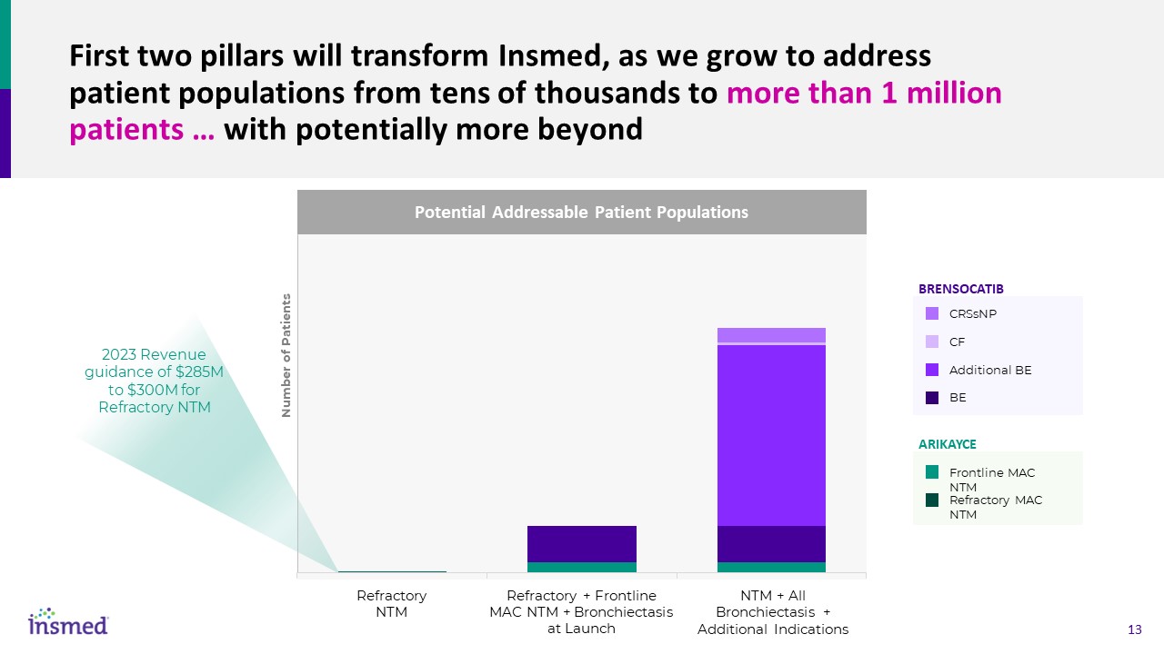 First two pillars will transform Insmed, as we grow to address patient populations from tens of thousands to more than 1 million patients … with potentially more beyond  Potential Addressable Patient Populations  Refractory  NTM  NTM + All Bronchiectasis + Additional Indications  Refractory + Frontline MAC NTM + Bronchiectasis at Launch  BRENSOCATIB  ARIKAYCE  CRSsNP  CF  Additional BE  BE  Frontline MAC NTM  Refractory MAC NTM  2023 Revenue guidance of $285M to $300M for Refractory NTM  Number of Patients