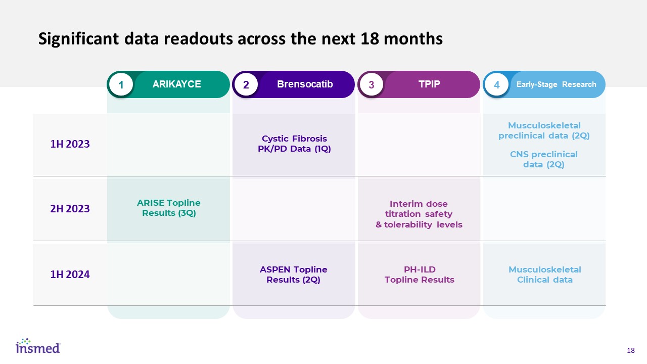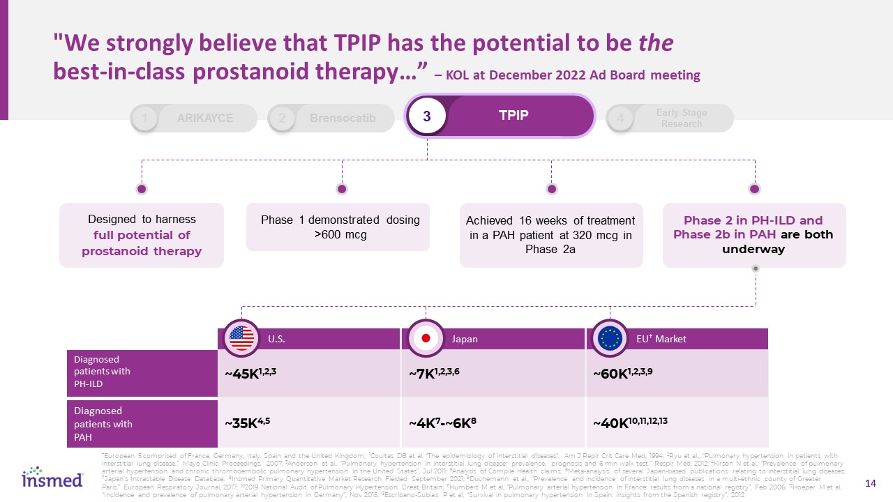 "We strongly believe that TPIP has the potential to be the best-in-class prostanoid therapy…” – KOL at December 2022 Ad Board meeting  Designed to harness   full potential of   prostanoid therapy  Phase 1 demonstrated dosing >600 mcg  Achieved 16 weeks of treatment in a PAH patient at 320 mcg in Phase 2a  Phase 2 in PH-ILD and Phase 2b in PAH are both underway   U.S.  Diagnosed   patients with   PH-ILD  Diagnosed   patients with   PAH  ~7K1,2,3,6  ~4K7-~6K8   Japan  ~45K1,2,3  ~35K4,5  ~60K1,2,3,9  ~40K10,11,12,13   EU† Market  2  Brensocatib  3  TPIP  1  ARIKAYCE  4  Early-Stage Research  †European 5 comprised of France, Germany, Italy, Spain and the United Kingdom; 1Coultas DB et al, “The epidemiology of interstitial diseases”, Am J Repir Crit Care Med, 1994; 2Ryu et al., “Pulmonary hypertension in patients with interstitial lung disease.” Mayo Clinic Proceedings, 2007; 3Anderson et al., “Pulmonary hypertension in interstitial lung disease: prevalence, prognosis and 6 min walk test.” Respir Med, 2012; 4Kirson N et al, “Prevalence of pulmonary arterial hypertension and chronic thromboembolic pulmonary hypertension in the United States”, Jul 2011; 5Analysis of Compile Health claims; 6Meta-analysis of several Japan-based publications relating to interstitial lung diseases; 7Japan’s Intractable Disease Database; 8Insmed Primary Quantitative Market Research Fielded September 2021; 9Duchemann et al., “Prevalence and incidence of interstitial lung diseases in a multi-ethnic county of Greater Paris.” European Respiratory Journal, 2017; 102019 National Audit of Pulmonary Hypertension Great Britain; 11Humbert M et al, “Pulmonary arterial hypertension in France: results from a national registry”, Feb 2006; 12Hoeper M et al, “Incidence and prevalence of pulmonary arterial hypertension in Germany”, Nov 2015; 13Escribano-Subias P et al, “Survival in pulmonary hypertension in Spain: insights from the Spanish registry”, 2012