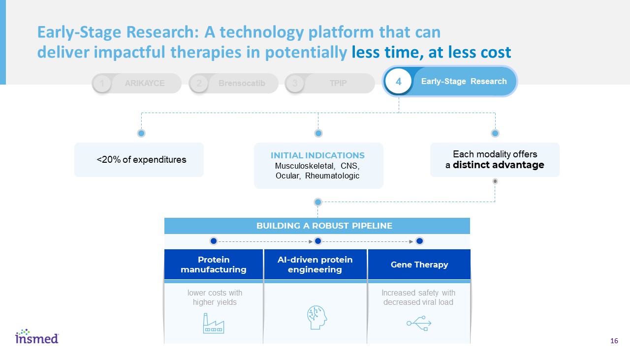 <20% of expenditures  Each modality offers a distinct advantage  INITIAL INDICATIONS Musculoskeletal, CNS, Ocular, Rheumatologic  3  TPIP  Early-Stage Research: A technology platform that can deliver impactful therapies in potentially less time, at less cost   4  Early-Stage Research  2  Brensocatib  1  ARIKAYCE  AI-driven protein engineering  Gene Therapy  Protein manufacturing  BUILDING A ROBUST PIPELINE  Increased safety with decreased viral load  lower costs with higher yields