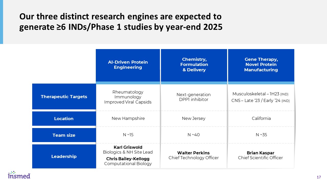 Our three distinct research engines are expected to generate ≥6 INDs/Phase 1 studies by year-end 2025  Chemistry,   Formulation & Delivery  Gene Therapy,  Novel Protein Manufacturing  AI-Driven Protein Engineering  Therapeutic Targets  Location  Team size  Leadership  Rheumatology  Immunology  Improved Viral Capsids  Next-generation DPP1 inhibitor  Musculoskeletal – 1H23 (IND)  CNS – Late ‘23 / Early ’24 (IND)  New Jersey  New Hampshire  California  N ~40  N ~15  N ~35  Karl Griswold  Biologics & NH Site Lead  Chris Bailey-KelloggComputational Biology  Walter Perkins   Chief Technology Officer  Brian Kaspar   Chief Scientific Officer