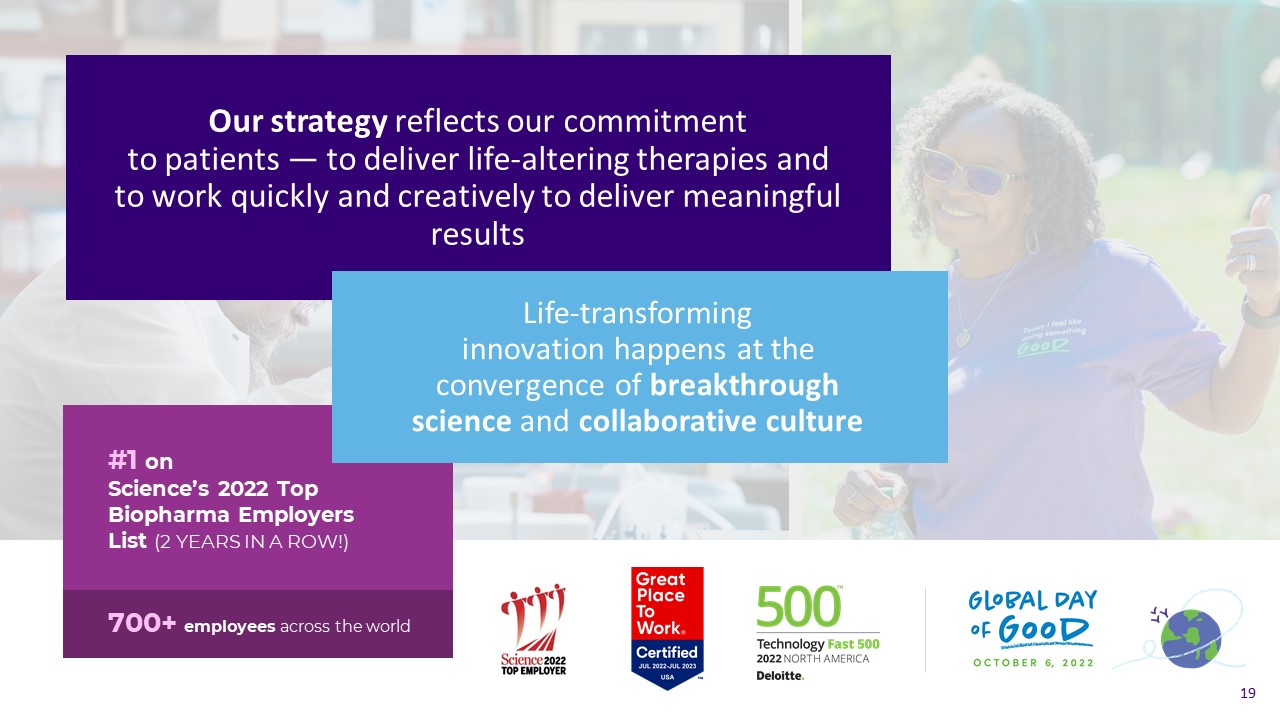 Our strategy reflects our commitment to patients — to deliver life-altering therapies and to work quickly and creatively to deliver meaningful results  Life-transforming innovation happens at theconvergence of breakthrough science and collaborative culture  #1 on Science’s 2022 Top Biopharma Employers List (2 YEARS IN A ROW!)  700+ employees across the world  19