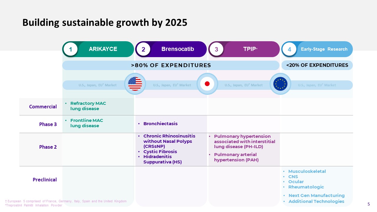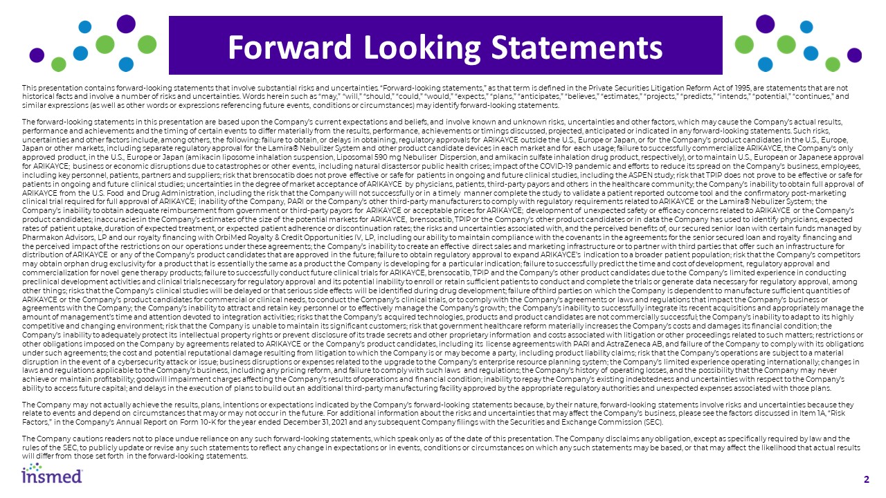 Forward Looking Statement  Forward Looking Statements  This presentation contains forward-looking statements that involve substantial risks and uncertainties. “Forward-looking statements,” as that term is defined in the Private Securities Litigation Reform Act of 1995, are statements that are not historical facts and involve a number of risks and uncertainties. Words herein such as “may,” “will,” “should,” “could,” “would,” “expects,” “plans,” “anticipates,” “believes,” “estimates,” “projects,” “predicts,” “intends,” “potential,” “continues,” and similar expressions (as well as other words or expressions referencing future events, conditions or circumstances) may identify forward-looking statements.  The forward-looking statements in this presentation are based upon the Company’s current expectations and beliefs, and involve known and unknown risks, uncertainties and other factors, which may cause the Company’s actual results, performance and achievements and the timing of certain events to differ materially from the results, performance, achievements or timings discussed, projected, anticipated or indicated in any forward-looking statements. Such risks, uncertainties and other factors include, among others, the following: failure to obtain, or delays in obtaining, regulatory approvals for ARIKAYCE outside the U.S., Europe or Japan, or for the Company’s product candidates in the U.S., Europe, Japan or other markets, including separate regulatory approval for the Lamira® Nebulizer System and other product candidate devices in each market and for each usage; failure to successfully commercialize ARIKAYCE, the Company's only approved product, in the U.S., Europe or Japan (amikacin liposome inhalation suspension, Liposomal 590 mg Nebuliser  Dispersion, and amikacin sulfate inhalation drug product, respectively), or to maintain U.S., European or Japanese approval for ARIKAYCE; business or economic disruptions due to catastrophes or other events, including natural disasters or public health crises; impact of the COVID-19 pandemic and efforts to reduce its spread on the Company’s business, employees, including key personnel, patients, partners and suppliers; risk that brensocatib does not prove effective or safe for patients in ongoing and future clinical studies, including the ASPEN study; risk that TPIP does not prove to be effective or safe for patients in ongoing and future clinical studies; uncertainties in the degree of market acceptance of ARIKAYCE by physicians, patients, third-party payors and others in the healthcare community; the Company’s inability to obtain full approval of ARIKAYCE from the U.S. Food and Drug Administration, including the risk that the Company will not successfully or in a timely  manner complete the study to validate a patient reported outcome tool and the confirmatory post-marketing clinical trial required for full approval of ARIKAYCE; inability of the Company, PARI or the Company’s other third-party manufacturers to comply with regulatory requirements related to ARIKAYCE or the Lamira® Nebulizer System; the Company’s inability to obtain adequate reimbursement from government or third-party payors for ARIKAYCE or acceptable prices for ARIKAYCE; development of unexpected safety or efficacy concerns related to ARIKAYCE or the Company’s product candidates; inaccuracies in the Company’s estimates of the size of the potential markets for ARIKAYCE, brensocatib, TPIP or the Company’s other product candidates or in data the Company has used to identify physicians, expected rates of patient uptake, duration of expected treatment, or expected patient adherence or discontinuation rates; the risks and uncertainties associated with, and the perceived benefits of, our secured senior loan with certain funds managed by Pharmakon Advisors, LP and our royalty financing with OrbiMed Royalty & Credit Opportunities IV, LP, including our ability to maintain compliance with the covenants in the agreements for the senior secured loan and royalty financing and the perceived impact of the restrictions on our operations under these agreements; the Company’s inability to create an effective direct sales and marketing infrastructure or to partner with third parties that offer such an infrastructure for distribution of ARIKAYCE or any of the Company’s product candidates that are approved in the future; failure to obtain regulatory approval to expand ARIKAYCE’s indication to a broader patient population; risk that the Company’s competitors may obtain orphan drug exclusivity for a product that is essentially the same as a product the Company is developing for a particular indication; failure to successfully predict the time and cost of development, regulatory approval and commercialization for novel gene therapy products; failure to successfully conduct future clinical trials for ARIKAYCE, brensocatib, TPIP and the Company’s other product candidates due to the Company’s limited experience in conducting preclinical development activities and clinical trials necessary for regulatory approval and its potential inability to enroll or retain sufficient patients to conduct and complete the trials or generate data necessary for regulatory approval, among other things; risks that the Company’s clinical studies will be delayed or that serious side effects will be identified during drug development; failure of third parties on which the Company is dependent to manufacture sufficient quantities of ARIKAYCE or the Company’s product candidates for commercial or clinical needs, to conduct the Company’s clinical trials, or to comply with the Company’s agreements or laws and regulations that impact the Company’s business or agreements with the Company; the Company’s inability to attract and retain key personnel or to effectively manage the Company’s growth; the Company’s inability to su