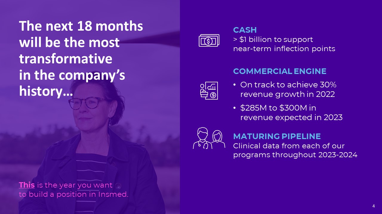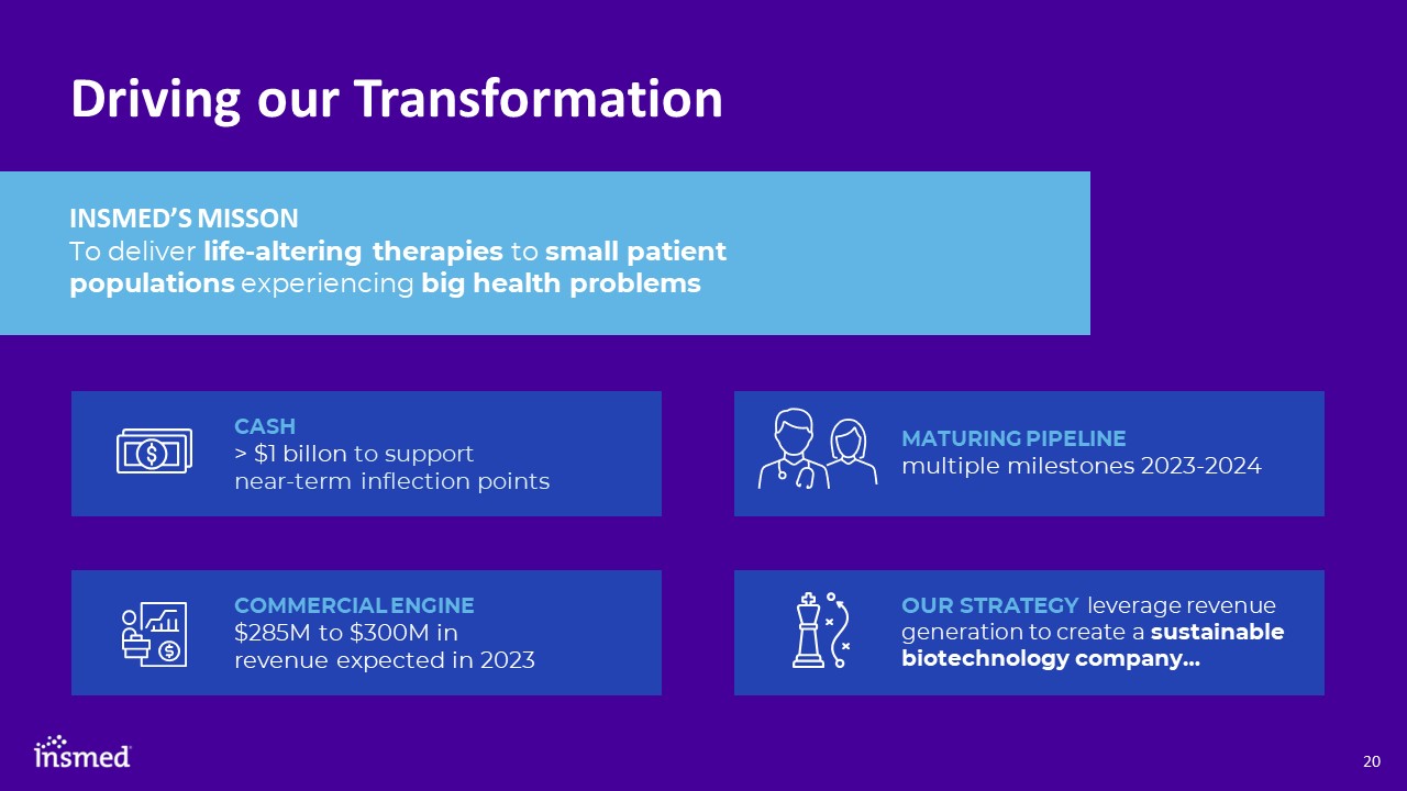 Driving our Transformation  INSMED’S MISSONTo deliver life-altering therapies to small patient populations experiencing big health problems     MATURING PIPELINE multiple milestones 2023-2024  OUR STRATEGY leverage revenue generation to create a sustainable biotechnology company…  CASH > $1 billon to support near-term inflection points  COMMERCIAL ENGINE $285M to $300M in revenue expected in 2023
