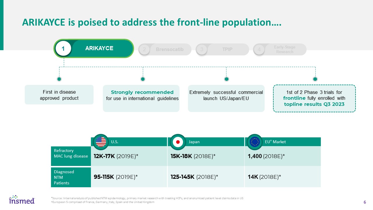 1  ARIKAYCE  ARIKAYCE is poised to address the front-line population….  First in diseaseapproved product  Strongly recommendedfor use in international guidelines  Extremely successful commercial launch US/Japan/EU  1st of 2 Phase 3 trials for frontline fully enrolled with topline results Q3 2023  12K-17K (2019E)*  95-115K (2019E)*   U.S.  Refractory MAC lung disease  DiagnosedNTMPatients  15K-18K (2018E)*  125-145K (2018E)*   Japan  1,400 (2018E)*  14K (2018E)*   EU† Market  2  Brensocatib  3  TPIP  4  Early-Stage Research  *Source: Internal analysis of published NTM epidemiology, primary market research with treating HCPs, and anonymized patient level claims data in US   †European 5 comprised of France, Germany, Italy, Spain and the United Kingdom
