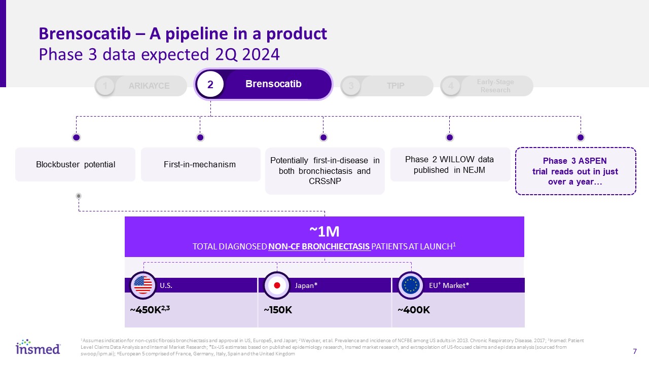 Brensocatib – A pipeline in a product Phase 3 data expected 2Q 2024  Blockbuster potential   2  Brensocatib  1  ARIKAYCE  3  TPIP  4  Early-Stage Research  First-in-mechanism  Potentially first-in-disease in both bronchiectasis and CRSsNP  Phase 2 WILLOW data published in NEJM  Phase 3 ASPEN trial reads out in just over a year…  1Assumes indication for non-cystic fibrosis bronchiectasis and approval in US, Europe5, and Japan; 2Weycker, et al. Prevalence and incidence of NCFBE among US adults in 2013. Chronic Respiratory Disease. 2017; 3Insmed: Patient Level Claims Data Analysis and Internal Market Research; *Ex-US estimates based on published epidemiology research, Insmed market research, and extrapolation of US-focused claims and epi data analysis (sourced from swoop/ipm.ai); †European 5 comprised of France, Germany, Italy, Spain and the United Kingdom †  ~450K2,3   U.S.  ~150K   Japan*  ~400K   EU† Market*  ~1M TOTAL DIAGNOSED NON-CF BRONCHIECTASIS PATIENTS AT LAUNCH1