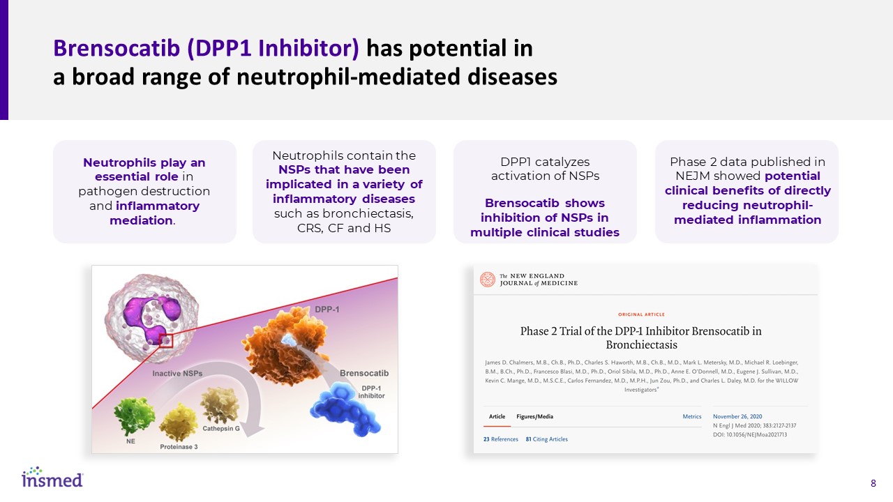 Brensocatib (DPP1 Inhibitor) has potential in a broad range of neutrophil-mediated diseases  Neutrophils play an essential role in pathogen destruction and inflammatory mediation.   Neutrophils contain the NSPs that have been implicated in a variety of inflammatory diseases such as bronchiectasis, CRS, CF and HS  DPP1 catalyzes activation of NSPs  Brensocatib shows inhibition of NSPs in multiple clinical studies  Phase 2 data published in NEJM showed potential clinical benefits of directly reducing neutrophil-mediated inflammation