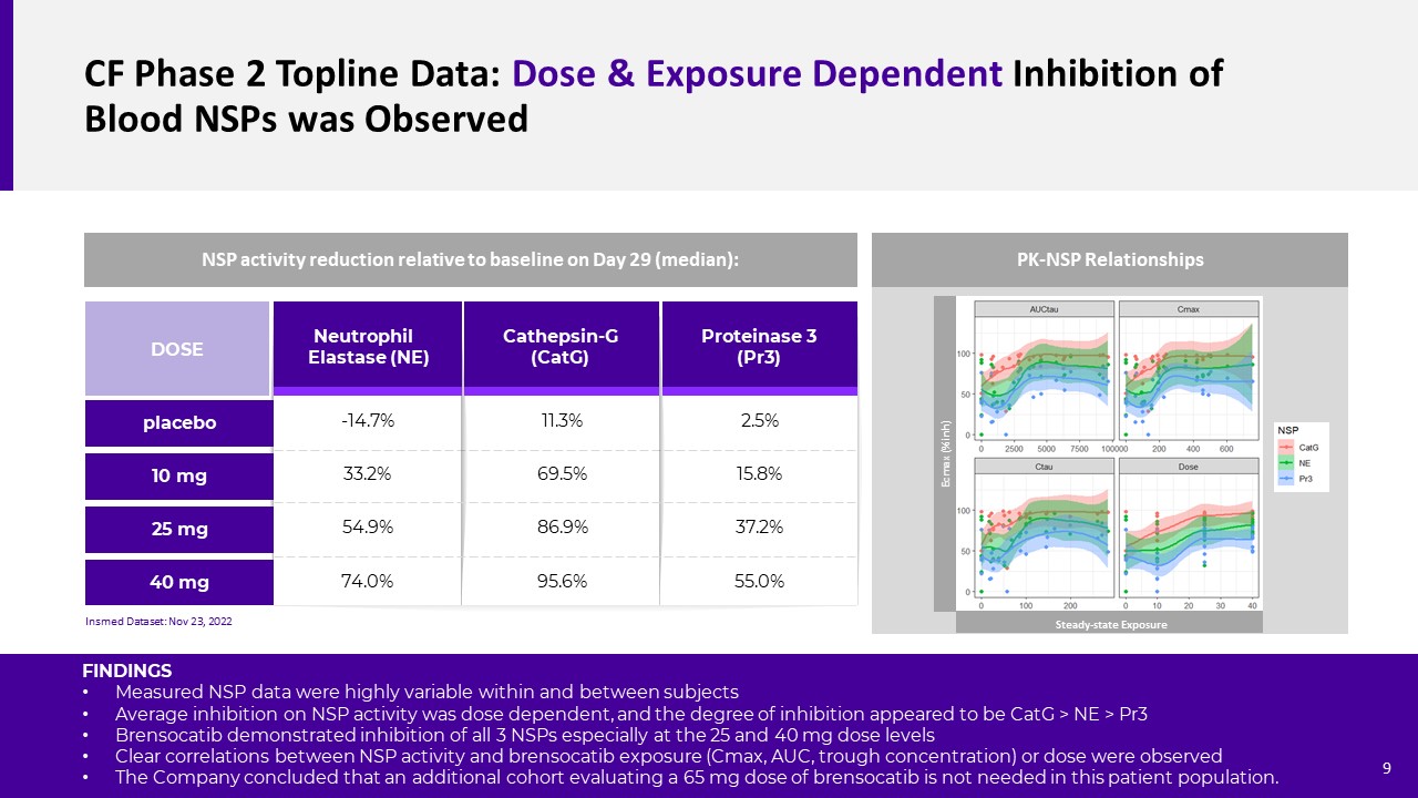 CF Phase 2 Topline Data: Dose & Exposure Dependent Inhibition of Blood NSPs was Observed  Cathepsin-G (CatG)  Proteinase 3 (Pr3)   Neutrophil    Elastase (NE)  10 mg  25 mg  DOSE  40 mg  placebo  -14.7%  33.2%  54.9%  74.0%  11.3%  69.5%  86.9%  95.6%  2.5%  15.8%  37.2%  55.0%  NSP activity reduction relative to baseline on Day 29 (median):  Insmed Dataset: Nov 23, 2022  PK-NSP Relationships  FINDINGS  Measured NSP data were highly variable within and between subjects   Average inhibition on NSP activity was dose dependent, and the degree of inhibition appeared to be CatG > NE > Pr3  Brensocatib demonstrated inhibition of all 3 NSPs especially at the 25 and 40 mg dose levels  Clear correlations between NSP activity and brensocatib exposure (Cmax, AUC, trough concentration) or dose were observed  The Company concluded that an additional cohort evaluating a 65 mg dose of brensocatib is not needed in this patient population.     Ecmax (%inh)  Steady-state Exposure  9
