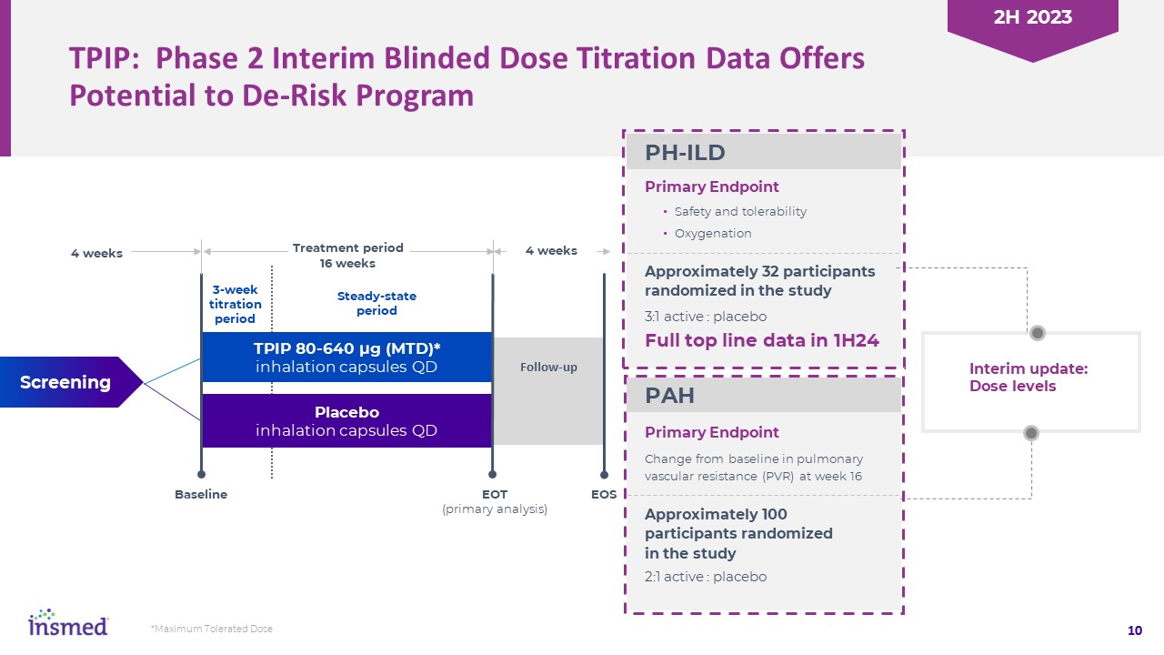 TPIP: Phase 2 Interim Blinded Dose Titration Data Offers Potential to De-Risk Program  Primary Endpoint  10  3:1 active : placebo  Safety and tolerability  Oxygenation  Approximately 32 participants randomized in the study   Change from baseline in pulmonary vascular resistance (PVR) at week 16  Primary Endpoint  Approximately 100 participants randomized   in the study   2:1 active : placebo  Full top line data in 1H24  4 weeks  TPIP 80-640 µg (MTD)*  inhalation capsules QD   Placebo  inhalation capsules QD   Screening  Treatment period  16 weeks  Baseline  EOT  (primary analysis)  EOS  4 weeks  Follow-up  Steady-state period  3-week titration period  Interim update: Dose levels  PH-ILD  PAH  *Maximum Tolerated Dose  2H 2023
