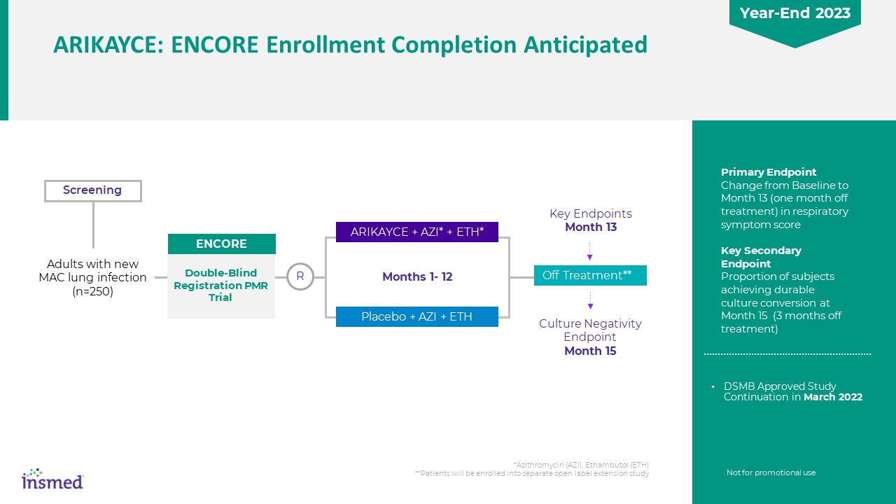 *Azithromycin (AZI), Ethambutol (ETH)  **Patients will be enrolled into separate open label extension study  Primary Endpoint  Change from Baseline to Month 13 (one month off treatment) in respiratory symptom score  Key Secondary Endpoint  Proportion of subjects achieving durable culture conversion at Month 15 (3 months off treatment)  Screening  Key Endpoints   Month 13   Culture Negativity Endpoint  Month 15  ARIKAYCE + AZI* + ETH*  Placebo + AZI + ETH  Months 1- 12  Adults with new MAC lung infection  (n=250)  Off Treatment**  Double-Blind Registration PMR Trial   ENCORE  R  Not for promotional use  DSMB Approved Study Continuation in March 2022  ARIKAYCE: ENCORE Enrollment Completion Anticipated  Year-End 2023
