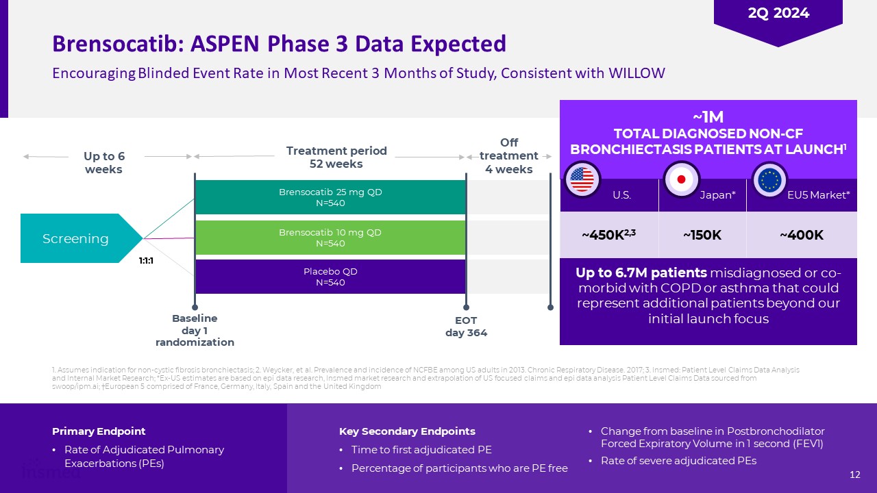 Brensocatib: ASPEN Phase 3 Data Expected  Encouraging Blinded Event Rate in Most Recent 3 Months of Study, Consistent with WILLOW  ~1M TOTAL DIAGNOSED NON-CF BRONCHIECTASIS PATIENTS AT LAUNCH1  ~450K2,3   U.S.  ~150K   Japan*  ~400K   EU5 Market*  Up to 6.7M patients misdiagnosed or co-morbid with COPD or asthma that could represent additional patients beyond our initial launch focus  Brensocatib 25 mg QD  N=540  Brensocatib 10 mg QD  N=540  Placebo QD  N=540   Screening  Treatment period  52 weeks  Baseline  day 1  randomization  EOT  day 364  Up to 6 weeks  1:1:1  Off treatment4 weeks  Primary Endpoint  Rate of Adjudicated Pulmonary Exacerbations (PEs)  Key Secondary Endpoints  Time to first adjudicated PE  Percentage of participants who are PE free  Change from baseline in Postbronchodilator Forced Expiratory Volume in 1 second (FEV1)  Rate of severe adjudicated PEs  1. Assumes indication for non-cystic fibrosis bronchiectasis; 2. Weycker, et al. Prevalence and incidence of NCFBE among US adults in 2013. Chronic Respiratory Disease. 2017; 3. Insmed: Patient Level Claims Data Analysis and Internal Market Research; *Ex-US estimates are based on epi data research, Insmed market research and extrapolation of US focused claims and epi data analysis Patient Level Claims Data sourced from swoop/ipm.ai; †European 5 comprised of France, Germany, Italy, Spain and the United Kingdom †  12  2Q 2024