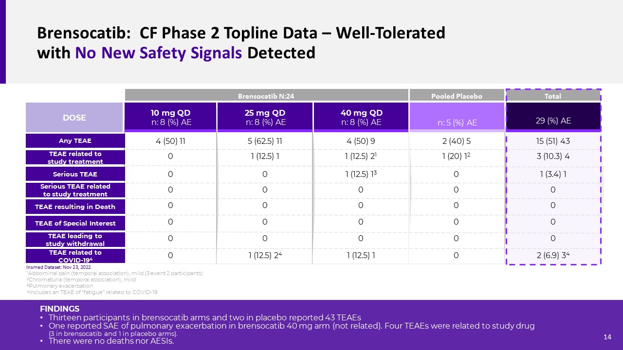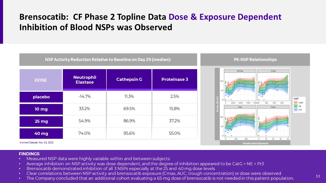 Brensocatib: CF Phase 2 Topline Data Dose & Exposure Dependent Inhibition of Blood NSPs was Observed  Cathepsin G  Proteinase 3  Neutrophil Elastase  10 mg  25 mg  DOSE  40 mg  placebo  -14.7%  33.2%  54.9%  74.0%  11.3%  69.5%  86.9%  95.6%  2.5%  15.8%  37.2%  55.0%  NSP Activity Reduction Relative to Baseline on Day 29 (median):  Insmed Dataset: Nov 23, 2022  PK-NSP Relationships  FINDINGS  Measured NSP data were highly variable within and between subjects   Average inhibition on NSP activity was dose dependent, and the degree of inhibition appeared to be CatG > NE > Pr3  Brensocatib demonstrated inhibition of all 3 NSPs especially at the 25 and 40 mg dose levels  Clear correlations between NSP activity and brensocatib exposure (Cmax, AUC, trough concentration) or dose were observed  The Company concluded that an additional cohort evaluating a 65 mg dose of brensocatib is not needed in this patient population.     Ecmax (%inh)  Steady-state Exposure  13