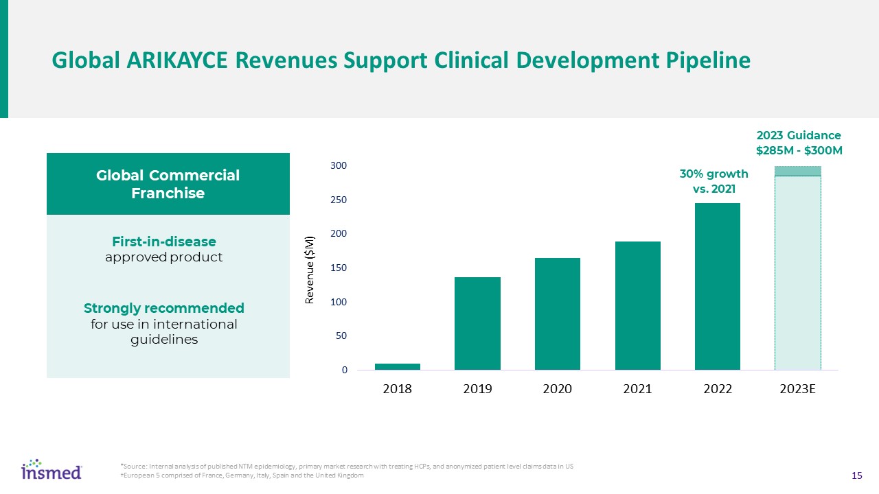 Global ARIKAYCE Revenues Support Clinical Development Pipeline  *Source: Internal analysis of published NTM epidemiology, primary market research with treating HCPs, and anonymized patient level claims data in US   †European 5 comprised of France, Germany, Italy, Spain and the United Kingdom  First-in-diseaseapproved product  Strongly recommendedfor use in international guidelines  Global Commercial Franchise  2023 Guidance  $285M - $300M  30% growth  vs. 2021