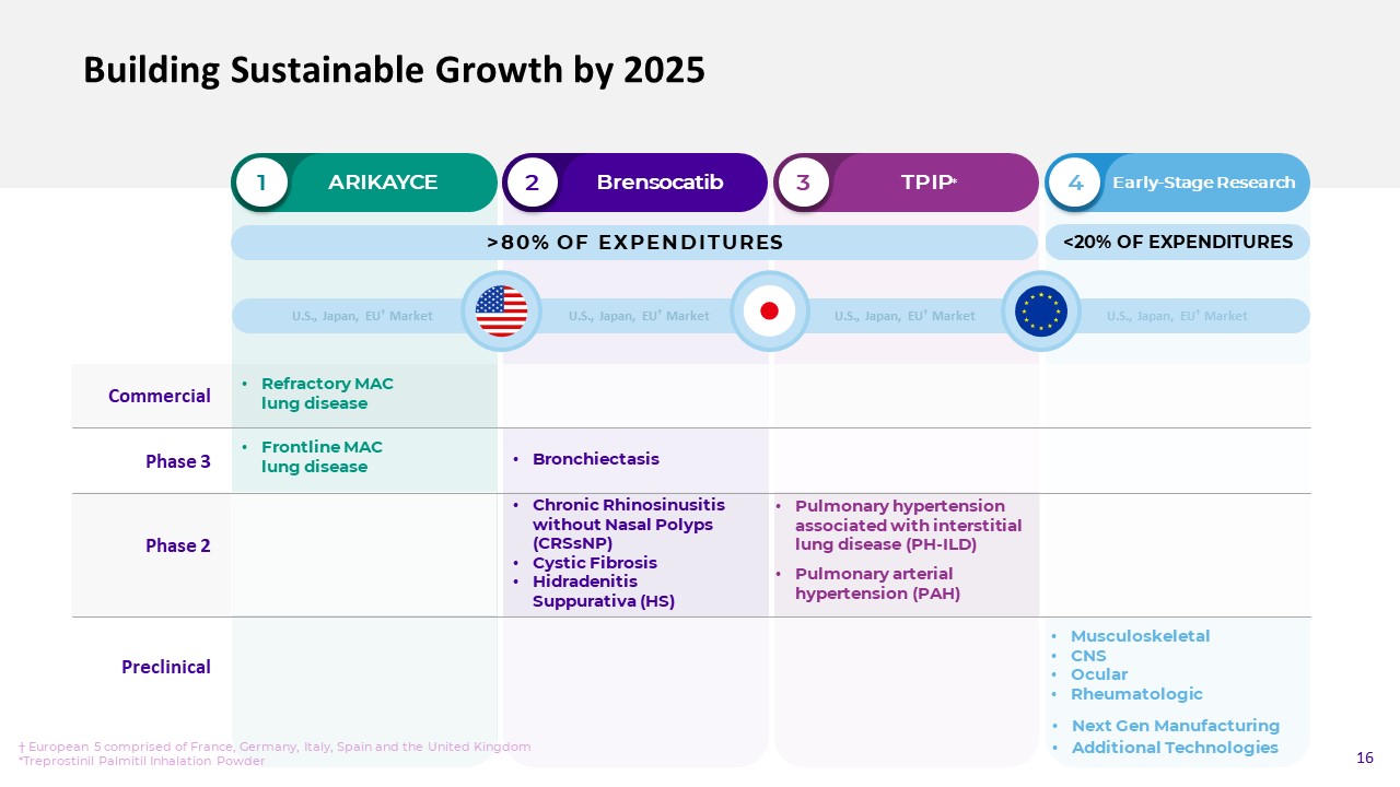 Building Sustainable Growth by 2025  Commercial  1  2  3  4  ARIKAYCE  Brensocatib  TPIP*  Early-Stage Research  Refractory MAC lung disease  Frontline MAClung disease  Next Gen Manufacturing  Additional Technologies  Phase 3  <20% OF EXPENDITURES  Phase 2  Preclinical  Bronchiectasis  Pulmonary hypertension associated with interstitial lung disease (PH-ILD)  Pulmonary arterial hypertension (PAH)  Musculoskeletal   CNS  Ocular  Rheumatologic  >80% OF EXPENDITURES  Chronic Rhinosinusitis without Nasal Polyps (CRSsNP)  Cystic Fibrosis  Hidradenitis Suppurativa (HS)  U.S., Japan, EU† Market  U.S., Japan, EU† Market  U.S., Japan, EU† Market  U.S., Japan, EU† Market  † European 5 comprised of France, Germany, Italy, Spain and the United Kingdom*Treprostinil Palmitil Inhalation Powder  16