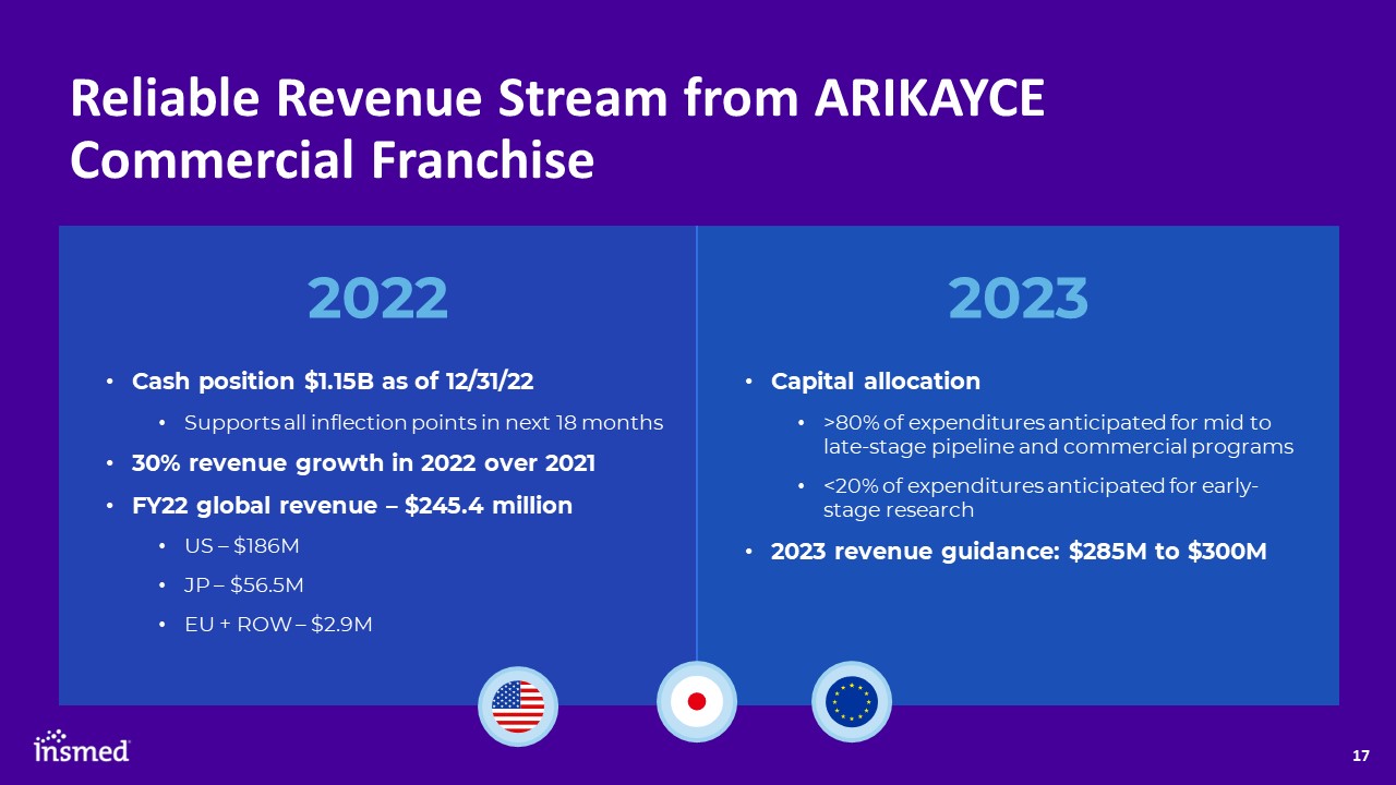 Reliable Revenue Stream from ARIKAYCE Commercial Franchise  Cash position $1.15B as of 12/31/22  Supports all inflection points in next 18 months  30% revenue growth in 2022 over 2021  FY22 global revenue – $245.4 million   US – $186M  JP – $56.5M  EU + ROW – $2.9M  2023  Capital allocation  >80% of expenditures anticipated for mid to late-stage pipeline and commercial programs  <20% of expenditures anticipated for early-stage research  2023 revenue guidance: $285M to $300M   2022