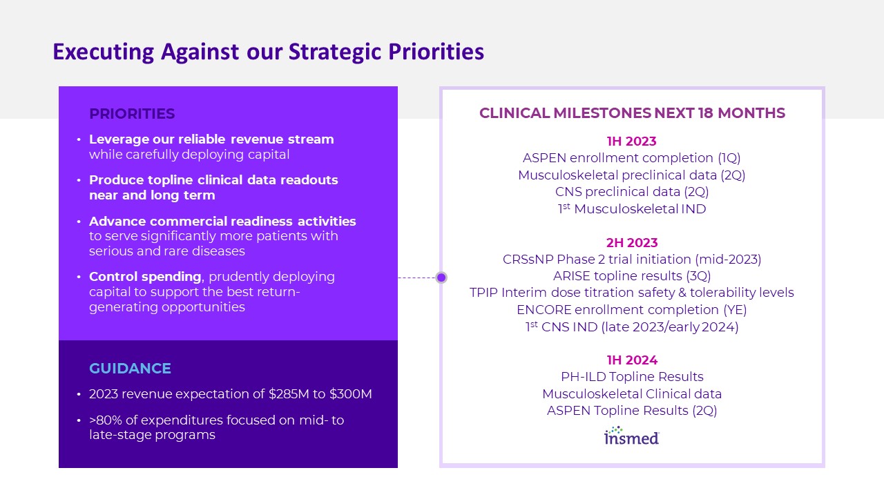 Executing Against our Strategic Priorities  Leverage our reliable revenue stream while carefully deploying capital  Produce topline clinical data readouts near and long term  Advance commercial readiness activities to serve significantly more patients with serious and rare diseases  Control spending, prudently deploying capital to support the best return-generating opportunities  PRIORITIES  2023 revenue expectation of $285M to $300M  >80% of expenditures focused on mid- to late-stage programs  GUIDANCE  CLINICAL MILESTONES NEXT 18 MONTHS  1H 2023  ASPEN enrollment completion (1Q)  Musculoskeletal preclinical data (2Q)  CNS preclinical data (2Q)  1st Musculoskeletal IND  2H 2023  CRSsNP Phase 2 trial initiation (mid-2023)  ARISE topline results (3Q)  TPIP Interim dose titration safety & tolerability levels  ENCORE enrollment completion (YE)  1st CNS IND (late 2023/early 2024)  1H 2024  PH-ILD Topline Results  Musculoskeletal Clinical data  ASPEN Topline Results (2Q)