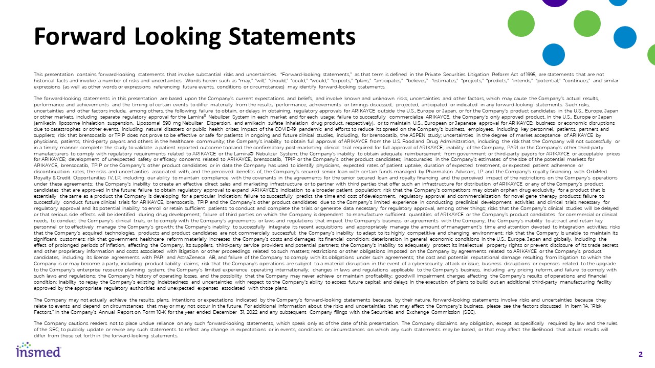 This presentation contains forward-looking statements that involve substantial risks and uncertainties. “Forward-looking statements,” as that term is defined in the Private Securities Litigation Reform Act of 1995, are statements that are not historical facts and involve a number of risks and uncertainties. Words herein such as “may,” “will,” “should,” “could,” “would,” “expects,” “plans,” “anticipates,” “believes,” “estimates,” “projects,” “predicts,” “intends,” “potential,” “continues,” and similar expressions (as well as other words or expressions referencing future events, conditions or circumstances) may identify forward-looking statements.  The forward-looking statements in this presentation are based upon the Company’s current expectations and beliefs, and involve known and unknown risks, uncertainties and other factors, which may cause the Company’s actual results, performance and achievements and the timing of certain events to differ materially from the results, performance, achievements or timings discussed, projected, anticipated or indicated in any forward-looking statements. Such risks, uncertainties and other factors include, among others, the following: failure to obtain, or delays in obtaining, regulatory approvals for ARIKAYCE outside the U.S., Europe or Japan, or for the Company’s product candidates in the U.S., Europe, Japan or other markets, including separate regulatory approval for the Lamira® Nebulizer System in each market and for each usage; failure to successfully commercialize ARIKAYCE, the Company's only approved product, in the U.S., Europe or Japan (amikacin liposome inhalation suspension, Liposomal 590 mg Nebuliser Dispersion, and amikacin sulfate inhalation drug product, respectively), or to maintain U.S., European or Japanese approval for ARIKAYCE; business or economic disruptions due to catastrophes or other events, including natural disasters or public health crises; impact of the COVID-19 pandemic and efforts to reduce its spread on the Company’s business, employees, including key personnel, patients, partners and suppliers; risk that brensocatib or TPIP does not prove to be effective or safe for patients in ongoing and future clinical studies, including, for brensocatib, the ASPEN study; uncertainties in the degree of market acceptance of ARIKAYCE by physicians, patients, third-party payors and others in the healthcare community; the Company’s inability to obtain full approval of ARIKAYCE from the U.S. Food and Drug Administration, including the risk that the Company will not successfully or in a timely manner complete the study to validate a patient reported outcome tool and the confirmatory post-marketing clinical trial required for full approval of ARIKAYCE; inability of the Company, PARI or the Company’s other third-party manufacturers to comply with regulatory requirements related to ARIKAYCE or the Lamira® Nebulizer System; the Company’s inability to obtain adequate reimbursement from government or third-party payors for ARIKAYCE or acceptable prices for ARIKAYCE; development of unexpected safety or efficacy concerns related to ARIKAYCE, brensocatib, TPIP or the Company’s other product candidates; inaccuracies in the Company’s estimates of the size of the potential markets for ARIKAYCE, brensocatib, TPIP or the Company’s other product candidates or in data the Company has used to identify physicians, expected rates of patient uptake, duration of expected treatment, or expected patient adherence or discontinuation rates; the risks and uncertainties associated with, and the perceived benefits of, the Company’s secured senior loan with certain funds managed by Pharmakon Advisors, LP and the Company’s royalty financing with OrbiMed Royalty & Credit Opportunities IV, LP, including our ability to maintain compliance with the covenants in the agreements for the senior secured loan and royalty financing and the perceived impact of the restrictions on the Company’s operations under these agreements; the Company’s inability to create an effective direct sales and marketing infrastructure or to partner with third parties that offer such an infrastructure for distribution of ARIKAYCE or any of the Company’s product candidates that are approved in the future; failure to obtain regulatory approval to expand ARIKAYCE’s indication to a broader patient population; risk that the Company’s competitors may obtain orphan drug exclusivity for a product that is essentially the same as a product the Company is developing for a particular indication; failure to successfully predict the time and cost of development, regulatory approval and commercialization for novel gene therapy products; failure to successfully conduct future clinical trials for ARIKAYCE, brensocatib, TPIP and the Company’s other product candidates due to the Company’s limited experience in conducting preclinical development activities and clinical trials necessary for regulatory approval and its potential inability to enroll or retain sufficient patients to conduct and complete the trials or generate data necessary for regulatory approval, among other things; risks that the Company’s clinical studies will be delayed or that serious side effects will be identified during drug development; failure of third parties on which the Company is dependent to manufacture sufficient quantities of ARIKAYCE or the Company’s product candidates for commercial or clinical needs, to conduct the Company’s clinical trials, or to comply with the Company’s agreements or laws and regulations that impact the Company’s business or agreements with the Company; the Company’s inability to attract and retain key personnel or to effectively manage the Company’s growth; the Company’s inability to successfully integrate its recent acquisitions and appropriately manage the amount of management’s time and attent