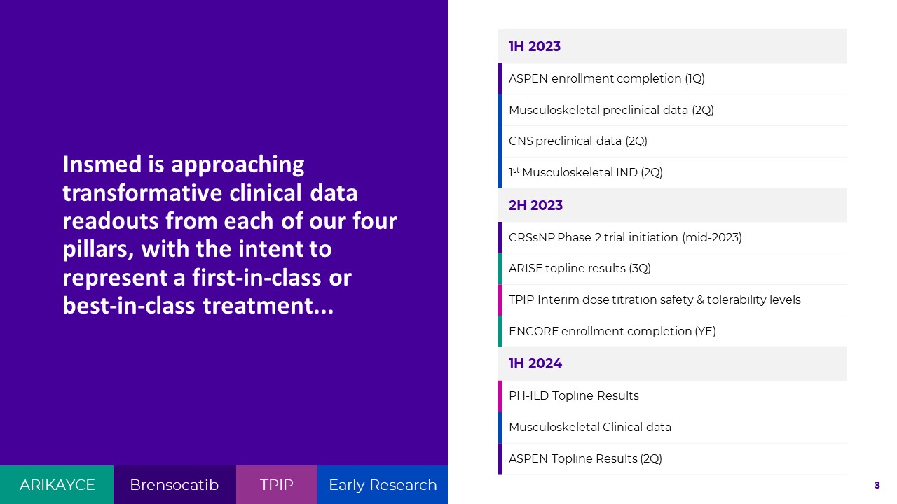 1H 2023  ASPEN enrollment completion (1Q)  Musculoskeletal preclinical data (2Q)  CNS preclinical data (2Q)  1st Musculoskeletal IND (2Q)  2H 2023  CRSsNP Phase 2 trial initiation (mid-2023)  ARISE topline results (3Q)  TPIP Interim dose titration safety & tolerability levels  ENCORE enrollment completion (YE)  1H 2024  PH-ILD Topline Results  Musculoskeletal Clinical data  ASPEN Topline Results (2Q)  Insmed is approaching transformative clinical data readouts from each of our four pillars, with the intent to represent a first-in-class or best-in-class treatment...  ARIKAYCE  Brensocatib  TPIP  Early Research