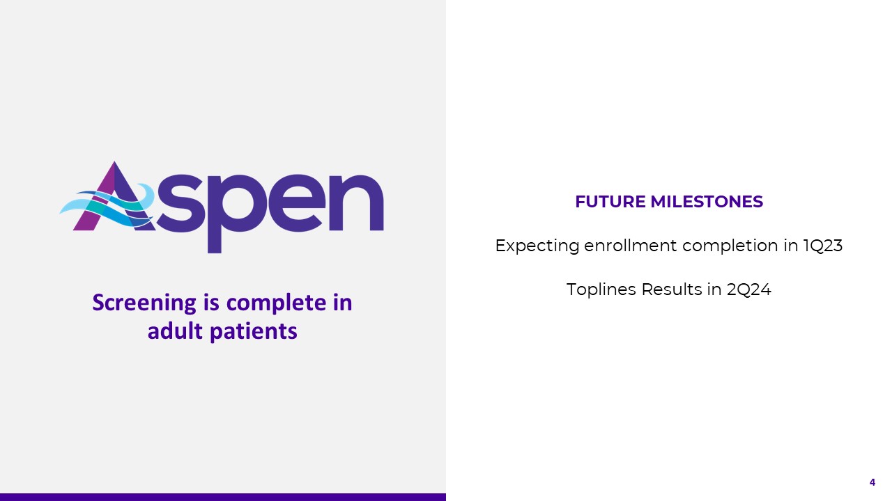 Screening is complete in adult patients  FUTURE MILESTONES  Expecting enrollment completion in 1Q23  Toplines Results in 2Q24