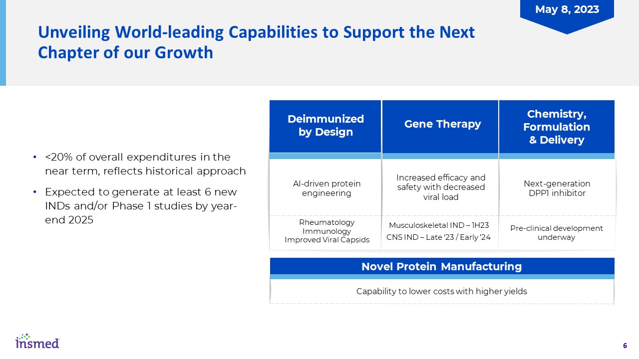 Unveiling World-leading Capabilities to Support the Next Chapter of our Growth  <20% of overall expenditures in the near term, reflects historical approach  Expected to generate at least 6 new INDs and/or Phase 1 studies by year-end 2025  Chemistry,   Formulation & Delivery  Gene Therapy  Deimmunized by Design  Rheumatology  Immunology  Improved Viral Capsids  Next-generation DPP1 inhibitor  Musculoskeletal IND – 1H23  CNS IND – Late ‘23 / Early ’24  Novel Protein Manufacturing  Increased efficacy and safety with decreased viral load  AI-driven protein engineering  Pre-clinical development underway  Capability to lower costs with higher yields  May 8, 2023