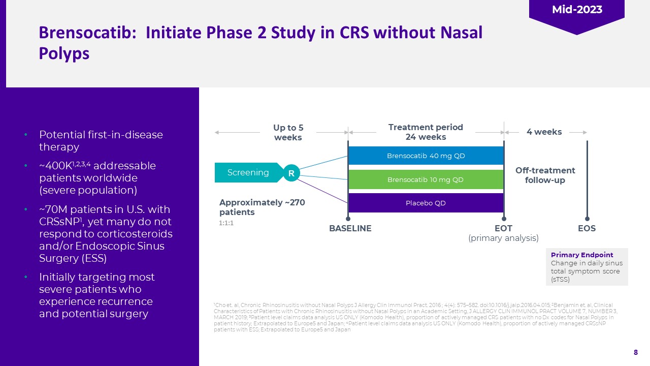 Brensocatib: Initiate Phase 2 Study in CRS without Nasal Polyps  Potential first-in-disease therapy  ~400K1,2,3,4 addressable patients worldwide (severe population)  ~70M patients in U.S. with CRSsNP1, yet many do not respond to corticosteroids and/or Endoscopic Sinus Surgery (ESS)  Initially targeting most severe patients who experience recurrence and potential surgery  1Cho et. al, Chronic Rhinosinusitis without Nasal Polyps J Allergy Clin Immunol Pract. 2016 ; 4(4): 575–582. doi:10.1016/j.jaip.2016.04.015; 2Benjamin et. al, Clinical Characteristics of Patients with Chronic Rhinosinusitis without Nasal Polyps in an Academic Setting, J ALLERGY CLIN IMMUNOL PRACT VOLUME 7, NUMBER 3, MARCH 2019; 3Patient level claims data analysis US ONLY (Komodo Health), proportion of actively managed CRS patients with no Dx codes for Nasal Polyps in patient history; Extrapolated to Europe5 and Japan; 4Patient level claims data analysis US ONLY (Komodo Health), proportion of actively managed CRSsNP patients with ESS; Extrapolated to Europe5 and Japan  Brensocatib 40 mg QD  Placebo QD   Screening  BASELINE  EOT (primary analysis)  Up to 5 weeks  Brensocatib 10 mg QD  4 weeks  Treatment period  24 weeks  EOS  R  Off-treatment follow-up  Primary Endpoint  Change in daily sinus total symptom score (sTSS)  Approximately ~270 patients  1:1:1  Mid-2023