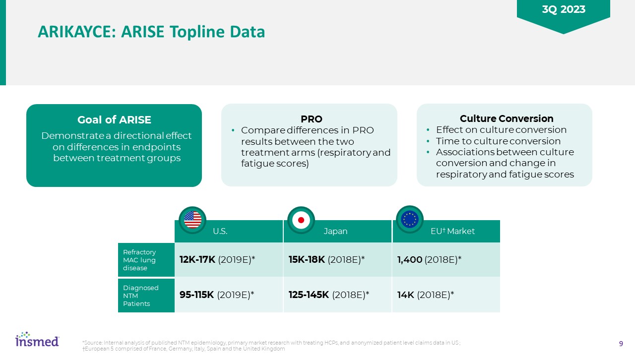 ARIKAYCE: ARISE Topline Data  PRO   Compare differences in PRO results between the two treatment arms (respiratory and fatigue scores)  Goal of ARISE  Demonstrate a directional effect on differences in endpoints between treatment groups  Culture Conversion  Effect on culture conversion  Time to culture conversion  Associations between culture conversion and change in respiratory and fatigue scores  *Source: Internal analysis of published NTM epidemiology, primary market research with treating HCPs, and anonymized patient level claims data in US ; †European 5 comprised of France, Germany, Italy, Spain and the United Kingdom  12K-17K (2019E)*  95-115K (2019E)*   U.S.  Refractory MAC lung disease  DiagnosedNTMPatients  15K-18K (2018E)*  125-145K (2018E)*   Japan  1,400 (2018E)*  14K (2018E)*   EU† Market  3Q 2023