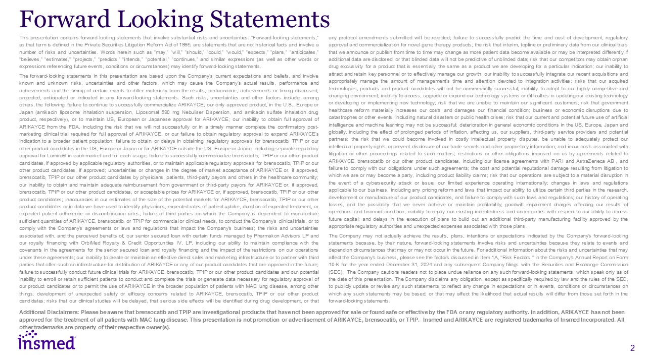 Forward Looking Statements  This presentation contains forward-looking statements that involve substantial risks and uncertainties. “Forward-looking statements,” as that term is defined in the Private Securities Litigation Reform Act of 1995, are statements that are not historical facts and involve a number of risks and uncertainties. Words herein such as “may,” “will,” “should,” “could,” “would,” “expects,” “plans,” “anticipates,” “believes,” “estimates,” “projects,” “predicts,” “intends,” “potential,” “continues,” and similar expressions (as well as other words or expressions referencing future events, conditions or circumstances) may identify forward-looking statements.  The forward-looking statements in this presentation are based upon the Company’s current expectations and beliefs, and involve known and unknown risks, uncertainties and other factors, which may cause the Company’s actual results, performance and achievements and the timing of certain events to differ materially from the results, performance, achievements or timing discussed, projected, anticipated or indicated in any forward-looking statements. Such risks, uncertainties and other factors include, among others, the following: failure to continue to successfully commercialize ARIKAYCE, our only approved product, in the U.S., Europe or Japan (amikacin liposome inhalation suspension, Liposomal 590 mg Nebuliser Dispersion, and amikacin sulfate inhalation drug product, respectively), or to maintain US, European or Japanese approval for ARIKAYCE; our inability to obtain full approval of ARIKAYCE from the FDA, including the risk that we will not successfully or in a timely manner complete the confirmatory post-marketing clinical trial required for full approval of ARIKAYCE, or our failure to obtain regulatory approval to expand ARIKAYCE’s indication to a broader patient population; failure to obtain, or delays in obtaining, regulatory approvals for brensocatib, TPIP or our other product candidates in the US, Europe or Japan or for ARIKAYCE outside the US, Europe or Japan, including separate regulatory approval for Lamira® in each market and for each usage; failure to successfully commercialize brensocatib, TPIP or our other product candidates, if approved by applicable regulatory authorities, or to maintain applicable regulatory approvals for brensocatib, TPIP or our other product candidates, if approved; uncertainties or changes in the degree of market acceptance of ARIKAYCE or, if approved, brensocatib, TPIP or our other product candidates by physicians, patients, third-party payors and others in the healthcare community; our inability to obtain and maintain adequate reimbursement from government or third-party payors for ARIKAYCE or, if approved, brensocatib, TPIP or our other product candidates, or acceptable prices for ARIKAYCE or, if approved, brensocatib, TPIP or our other product candidates; inaccuracies in our estimates of the size of the potential markets for ARIKAYCE, brensocatib, TPIP or our other product candidates or in data we have used to identify physicians, expected rates of patient uptake, duration of expected treatment, or expected patient adherence or discontinuation rates; failure of third parties on which the Company is dependent to manufacture sufficient quantities of ARIKAYCE, brensocatib, or TPIP for commercial or clinical needs, to conduct the Company's clinical trials, or to comply with the Company's agreements or laws and regulations that impact the Company's business; the risks and uncertainties associated with, and the perceived benefits of, our senior secured loan with certain funds managed by Pharmakon Advisors LP and our royalty financing with OrbiMed Royalty & Credit Opportunities IV, LP, including our ability to maintain compliance with the covenants in the agreements for the senior secured loan and royalty financing and the impact of the restrictions on our operations under these agreements; our inability to create or maintain an effective direct sales and marketing infrastructure or to partner with third parties that offer such an infrastructure for distribution of ARIKAYCE or any of our product candidates that are approved in the future; failure to successfully conduct future clinical trials for ARIKAYCE, brensocatib, TPIP or our other product candidates and our potential inability to enroll or retain sufficient patients to conduct and complete the trials or generate data necessary for regulatory approval of our product candidates or to permit the use of ARIKAYCE in the broader population of patients with MAC lung disease, among other things; development of unexpected safety or efficacy concerns related to ARIKAYCE, brensocatib, TPIP or our other product candidates; risks that our clinical studies will be delayed, that serious side effects will be identified during drug development, or that any protocol amendments submitted will be rejected; failure to successfully predict the time and cost of development, regulatory approval and commercialization for novel gene therapy products; the risk that interim, topline or preliminary data from our clinical trials that we announce or publish from time to time may change as more patient data become available or may be interpreted differently if additional data are disclosed, or that blinded data will not be predictive of unblinded data; risk that our competitors may obtain orphan drug exclusivity for a product that is essentially the same as a product we are developing for a particular indication; our inability to attract and retain key personnel or to effectively manage our growth; our inability to successfully integrate our recent acquisitions and appropriately manage the amount of management’s time and attention devoted to integration activities; risks that our acquired technologies, products and product candidates will not be commercially successful; inability to adap