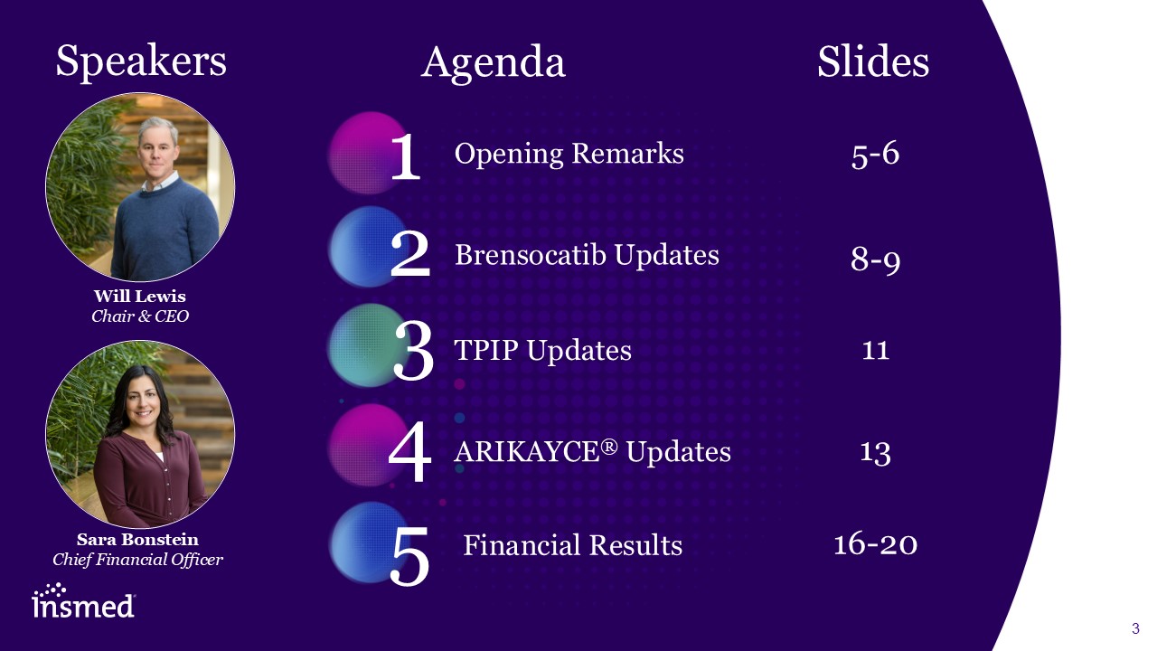 Opening Remarks  Brensocatib Updates  TPIP Updates  ARIKAYCE® Updates  Financial Results  5-6  8-9  11  13  16-20  Slides  Will Lewis  Chair & CEO  Sara Bonstein  Chief Financial Officer  Agenda  Speakers