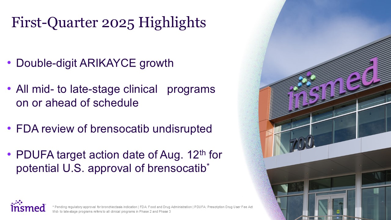First-Quarter 2025 Highlights  * Pending regulatory approval for bronchiectasis indication | FDA: Food and Drug Administration | PDUFA: Prescription Drug User Fee Act  Mid- to late-stage programs refers to all clinical programs in Phase 2 and Phase 3   Double-digit ARIKAYCE growth   All mid- to late-stage clinical programs on or ahead of schedule  FDA review of brensocatib undisrupted  PDUFA target action date of Aug. 12th for potential U.S. approval of brensocatib*