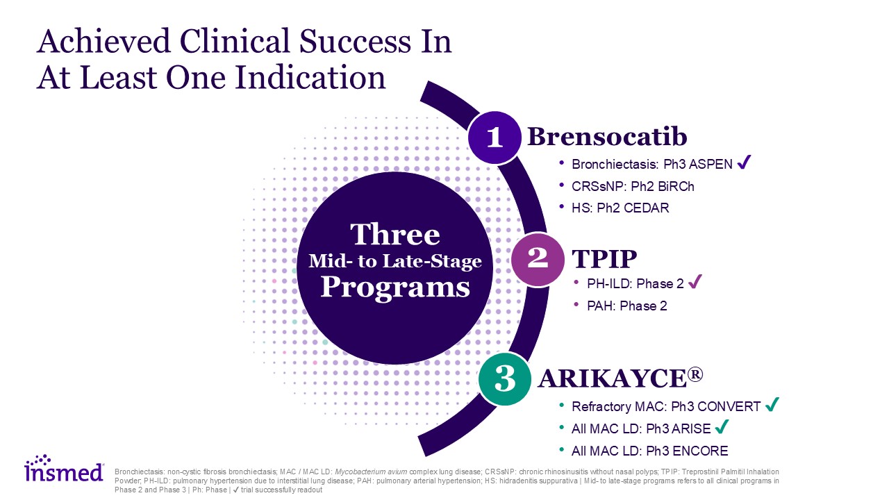 Bronchiectasis: Ph3 ASPEN ✔  CRSsNP: Ph2 BiRCh  HS: Ph2 CEDAR  1  2  3  PH-ILD: Phase 2 ✔  PAH: Phase 2  Refractory MAC: Ph3 CONVERT ✔  All MAC LD: Ph3 ARISE ✔  All MAC LD: Ph3 ENCORE  Brensocatib  ARIKAYCE®  TPIP  Three   Mid- to Late-Stage Programs   Bronchiectasis: non-cystic fibrosis bronchiectasis; MAC / MAC LD: Mycobacterium avium complex lung disease; CRSsNP: chronic rhinosinusitis without nasal polyps; TPIP: Treprostinil Palmitil Inhalation Powder; PH-ILD: pulmonary hypertension due to interstitial lung disease; PAH: pulmonary arterial hypertension; HS: hidradenitis suppurativa | Mid- to late-stage programs refers to all clinical programs in Phase 2 and Phase 3 | Ph: Phase | ✔ trial successfully readout   Achieved Clinical Success In At Least One Indication