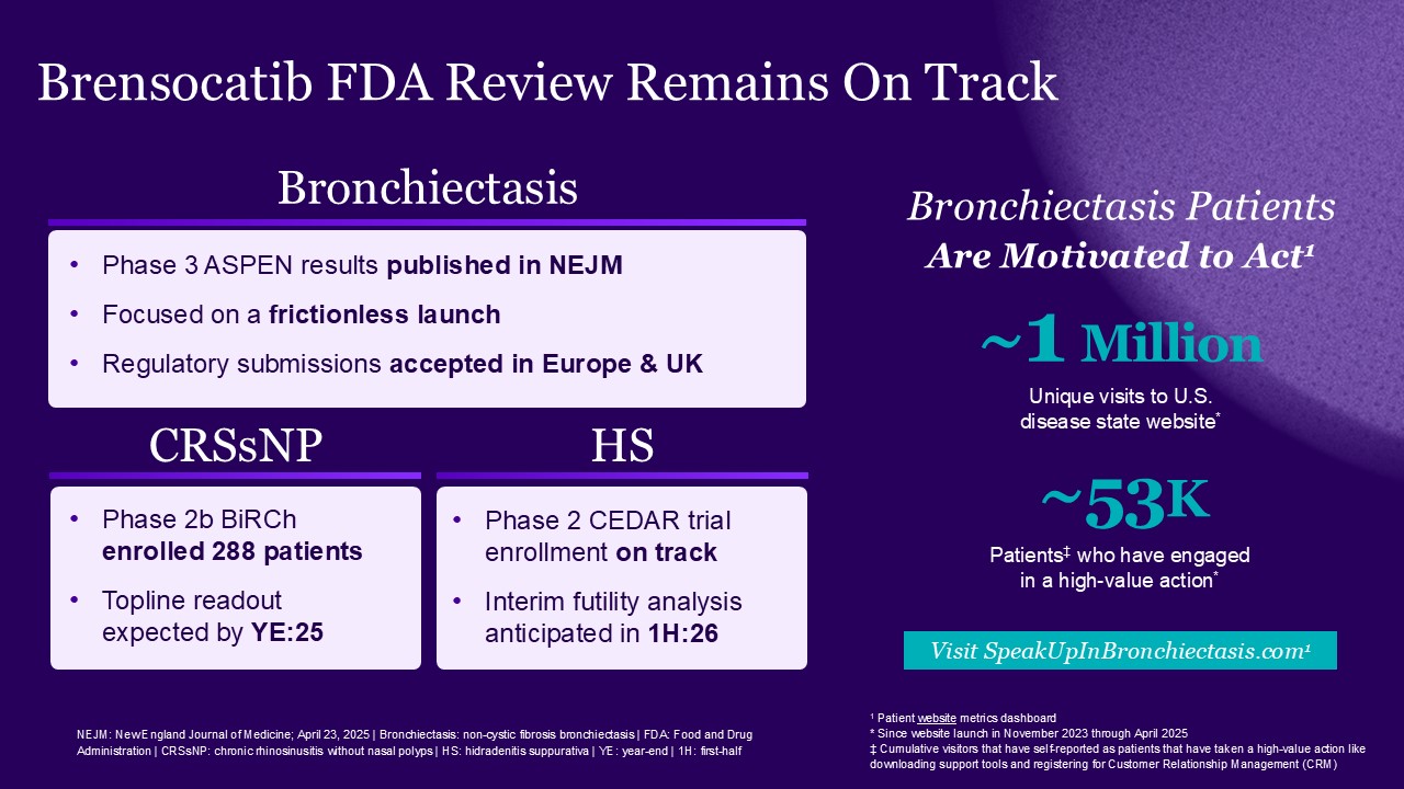 Brensocatib FDA Review Remains On Track  CRSsNP  Phase 2b BiRCh enrolled 288 patients  Topline readout expected by YE:25  Bronchiectasis  Phase 3 ASPEN results published in NEJM  Focused on a frictionless launch  Regulatory submissions accepted in Europe & UK  NEJM: New England Journal of Medicine; April 23, 2025 | Bronchiectasis: non-cystic fibrosis bronchiectasis | FDA: Food and Drug Administration | CRSsNP: chronic rhinosinusitis without nasal polyps | HS: hidradenitis suppurativa | YE: year-end | 1H: first-half  HS  Phase 2 CEDAR trial enrollment on track  Interim futility analysis anticipated in 1H:26  Bronchiectasis Patients  Are Motivated to Act1  ~1 Million  Unique visits to U.S.   disease state website*  ~53K  Patients‡ who have engaged   in a high-value action*  Visit SpeakUpInBronchiectasis.com1   1 Patient website metrics dashboard  * Since website launch in November 2023 through April 2025   ‡ Cumulative visitors that have self-reported as patients that have taken a high-value action like downloading support tools and registering for Customer Relationship Management (CRM)