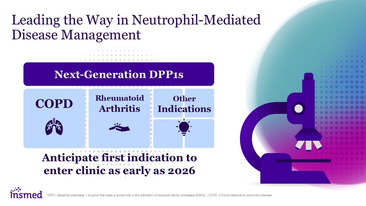 Next Gen DPP1  Leading the Way in Neutrophil-Mediated Disease Management  DPP1: dipeptidyl peptidase 1 enzyme that plays a crucial role in the activation of neutrophil serine proteases (NSPs). | COPD: Chronic obstructive pulmonary disease   Next-Generation DPP1s  COPD  Other Indications  Rheumatoid Arthritis  Anticipate first indication to enter clinic as early as 2026