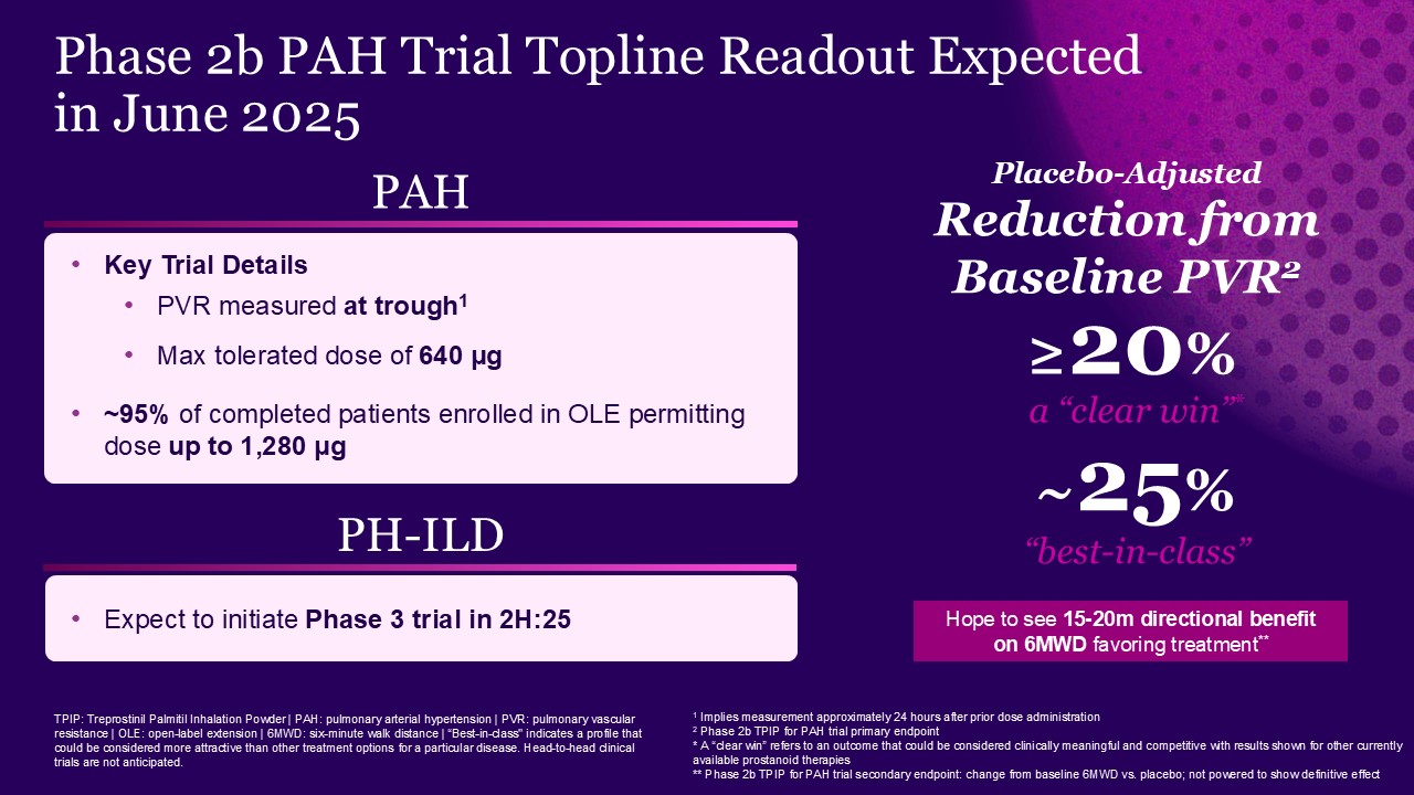 Phase 2b PAH Trial Topline Readout Expected in June 2025  PAH  Key Trial Details  PVR measured at trough1  Max tolerated dose of 640 μg  ~95% of completed patients enrolled in OLE permitting dose up to 1,280 μg  PH-ILD  Expect to initiate Phase 3 trial in 2H:25  TPIP: Treprostinil Palmitil Inhalation Powder | PAH: pulmonary arterial hypertension | PVR: pulmonary vascular resistance | OLE: open-label extension | 6MWD: six-minute walk distance | “Best-in-class" indicates a profile that could be considered more attractive than other treatment options for a particular disease. Head-to-head clinical trials are not anticipated.   Placebo-Adjusted   Reduction from Baseline PVR2  ≥20%    a “clear win”*  ~25%    “best-in-class”  Hope to see 15-20m directional benefit on 6MWD favoring treatment**  1 Implies measurement approximately 24 hours after prior dose administration   2 Phase 2b TPIP for PAH trial primary endpoint  * A “clear win” refers to an outcome that could be considered clinically meaningful and competitive with results shown for other currently available prostanoid therapies  ** Phase 2b TPIP for PAH trial secondary endpoint: change from baseline 6MWD vs. placebo; not powered to show definitive effect