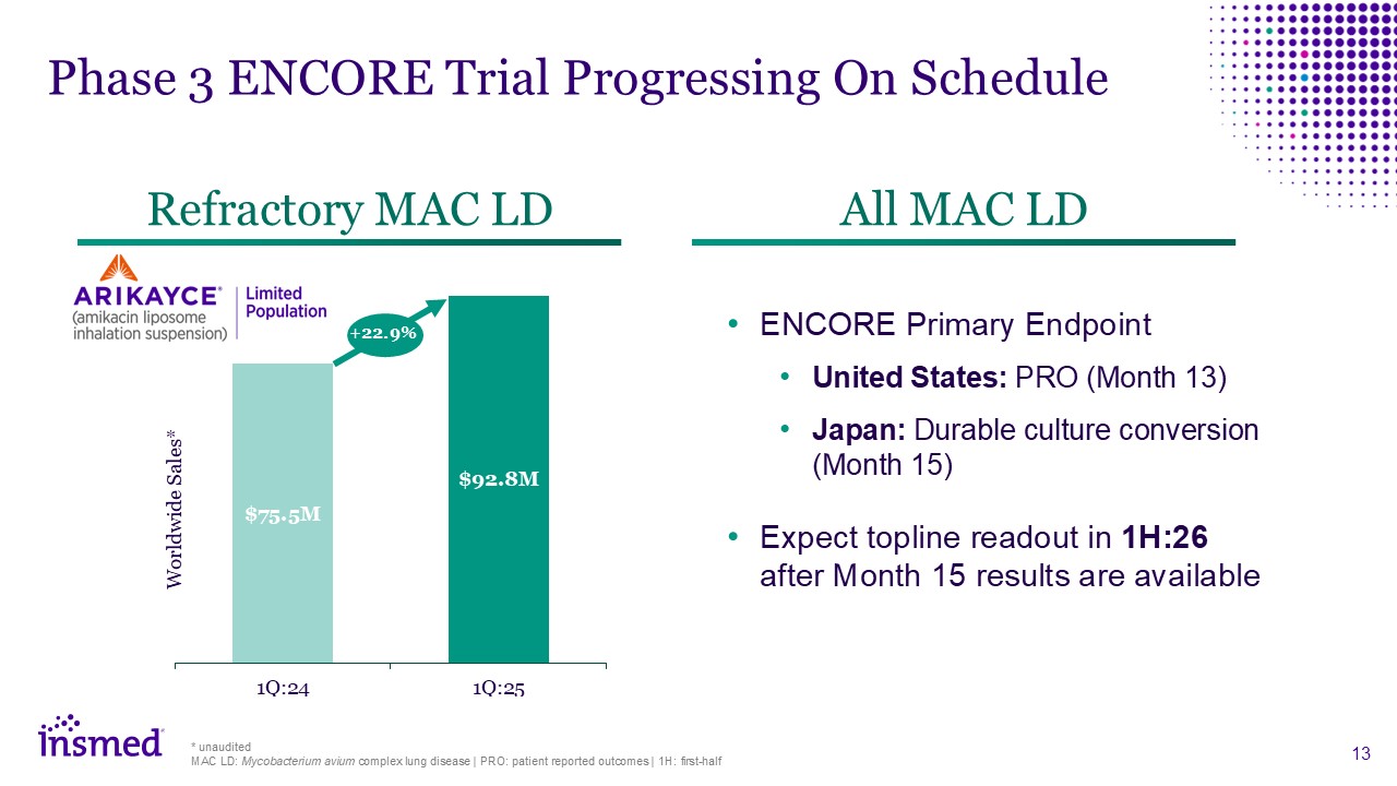 Phase 3 ENCORE Trial Progressing On Schedule  ENCORE Primary Endpoint  United States: PRO (Month 13)   Japan: Durable culture conversion (Month 15)  Expect topline readout in 1H:26 after Month 15 results are available  Worldwide Sales*  +22.9%  Refractory MAC LD  All MAC LD  * unaudited  MAC LD: Mycobacterium avium complex lung disease | PRO: patient reported outcomes | 1H: first-half